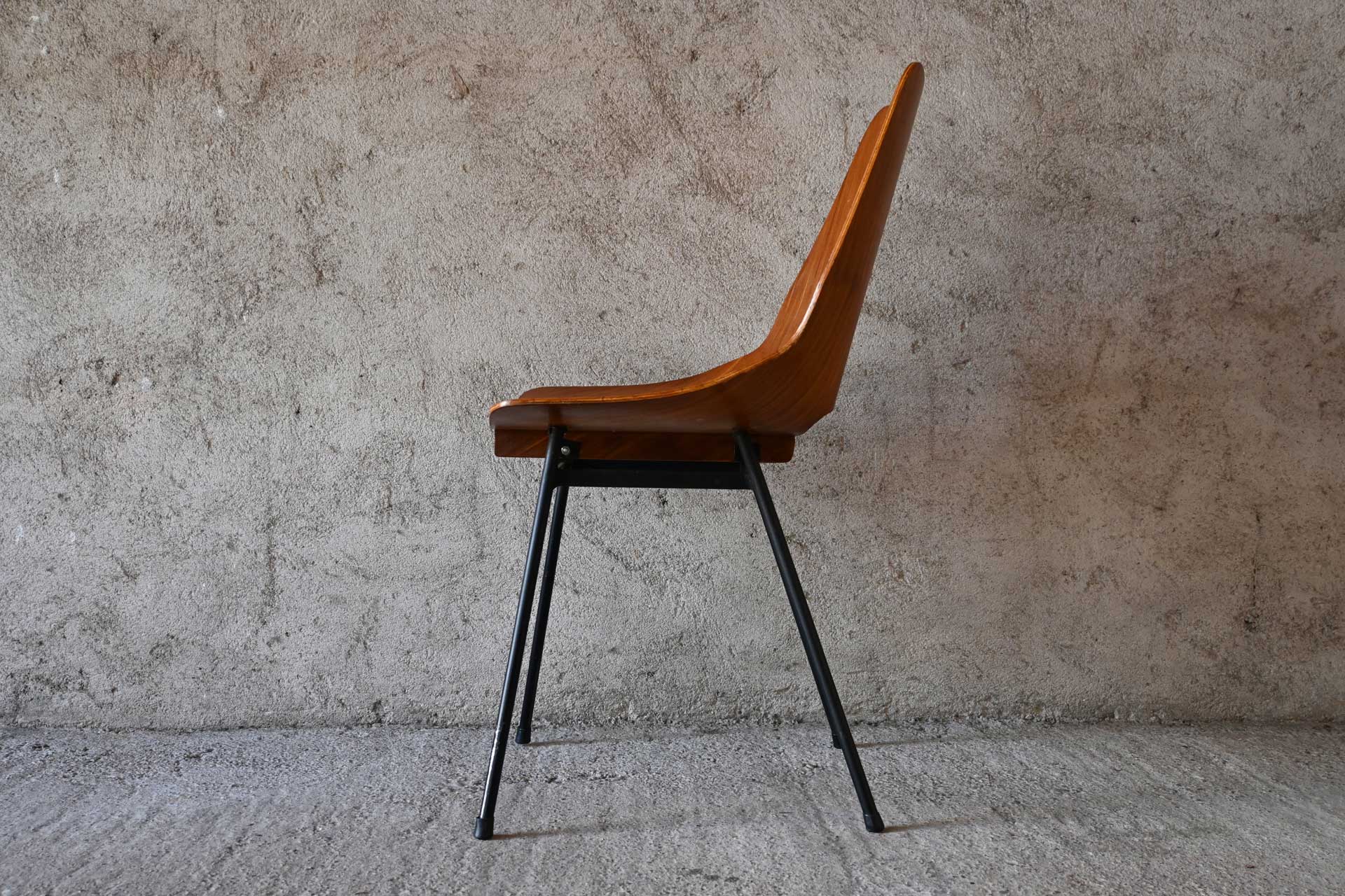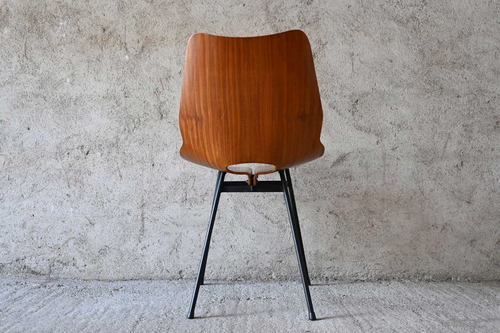 Set of six chairs produced by Curved Compensation Company Monza, 1960s. Shell in curved plywood veneered in teak, legs in black lacquered iron rod connected by a reinforcing ring.