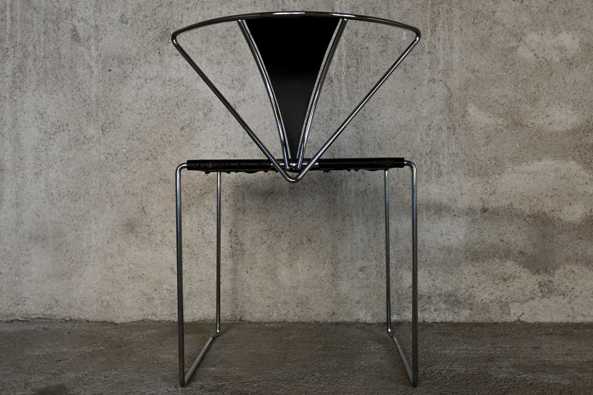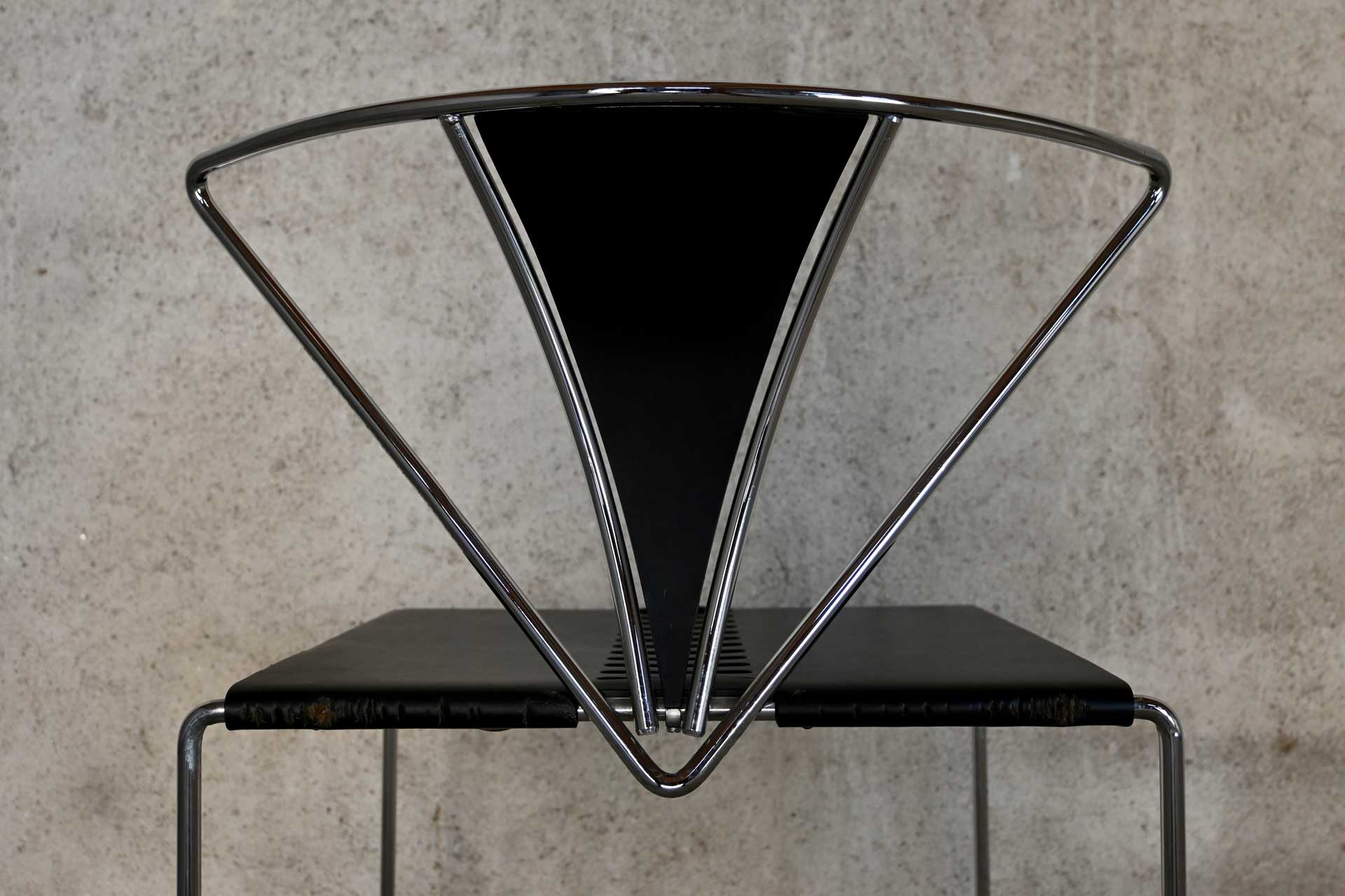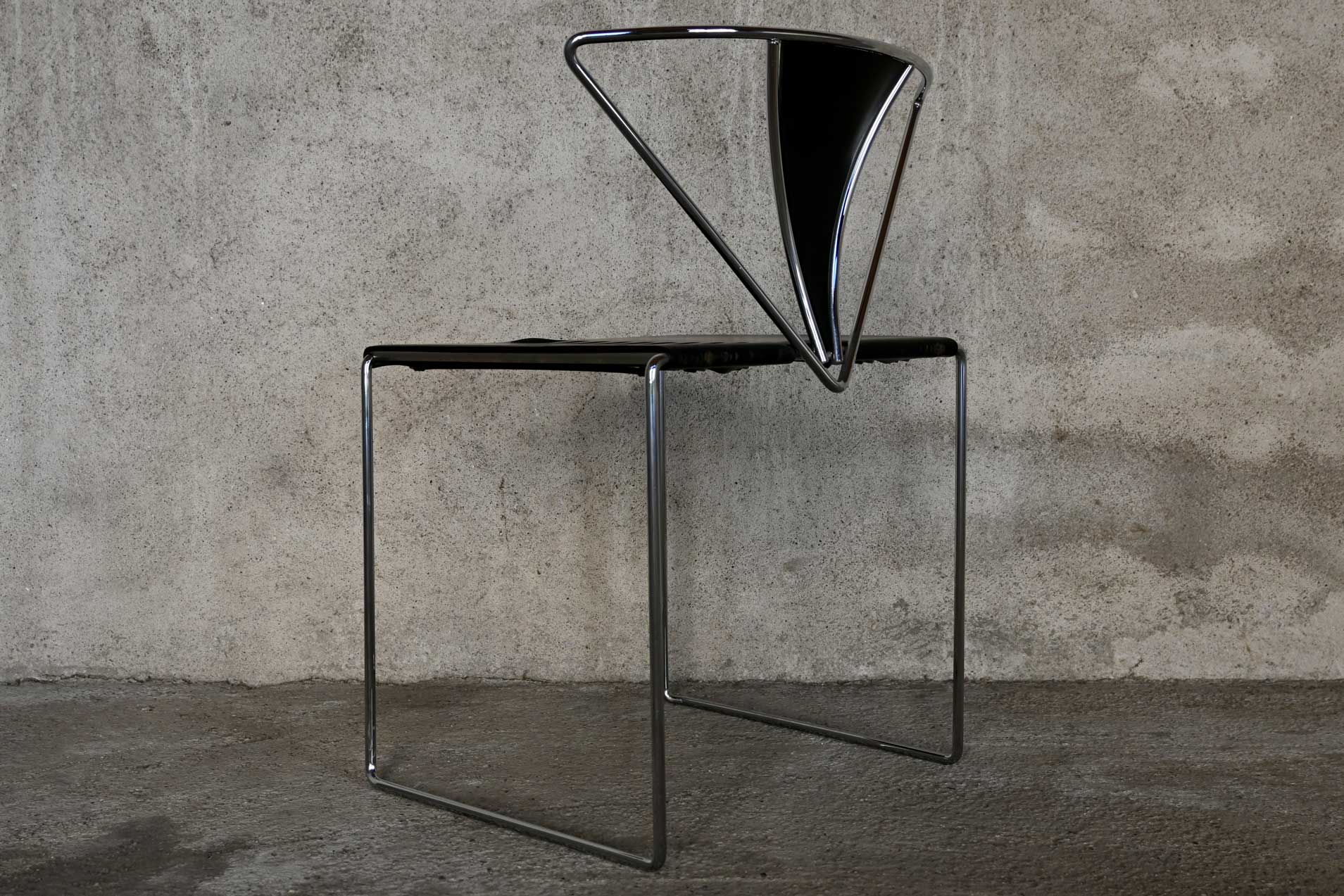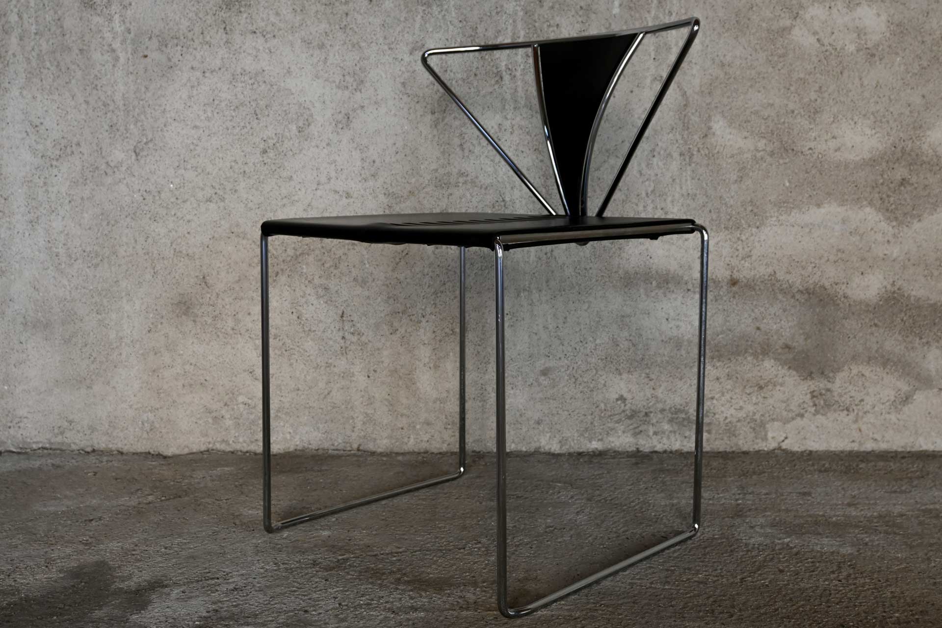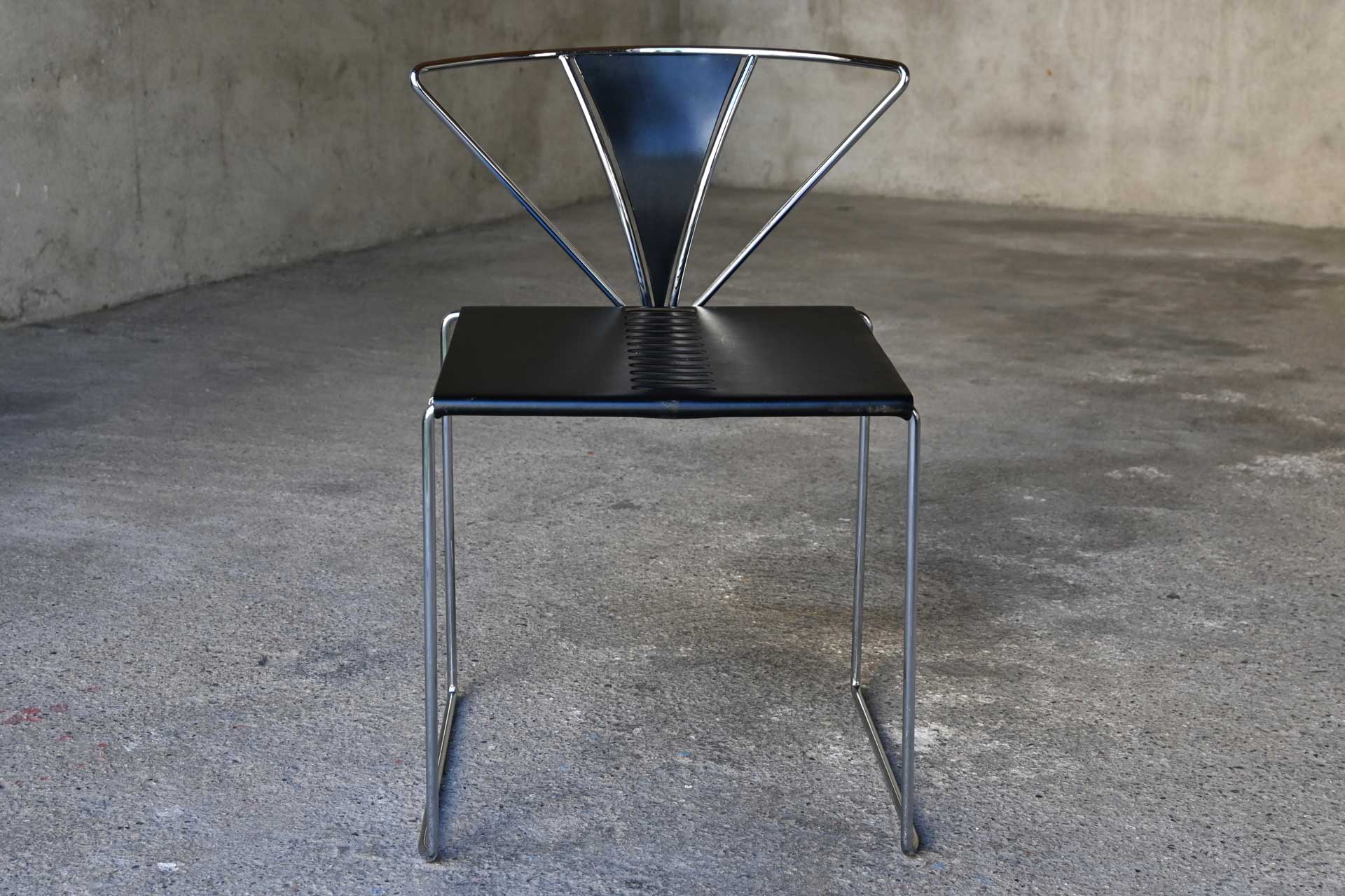 Stackable chair, Inside model, produced by Simon Gavina, designed by Kazuhide Takahama, 1991. Frame made of bent metal rod, induction-welded and chromed. Seat covered in black leather, matching the central segment of the fan-shaped backrest.