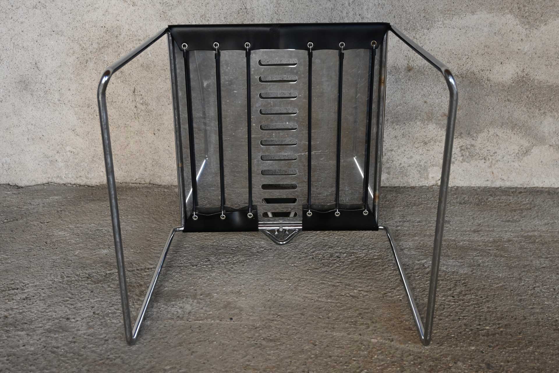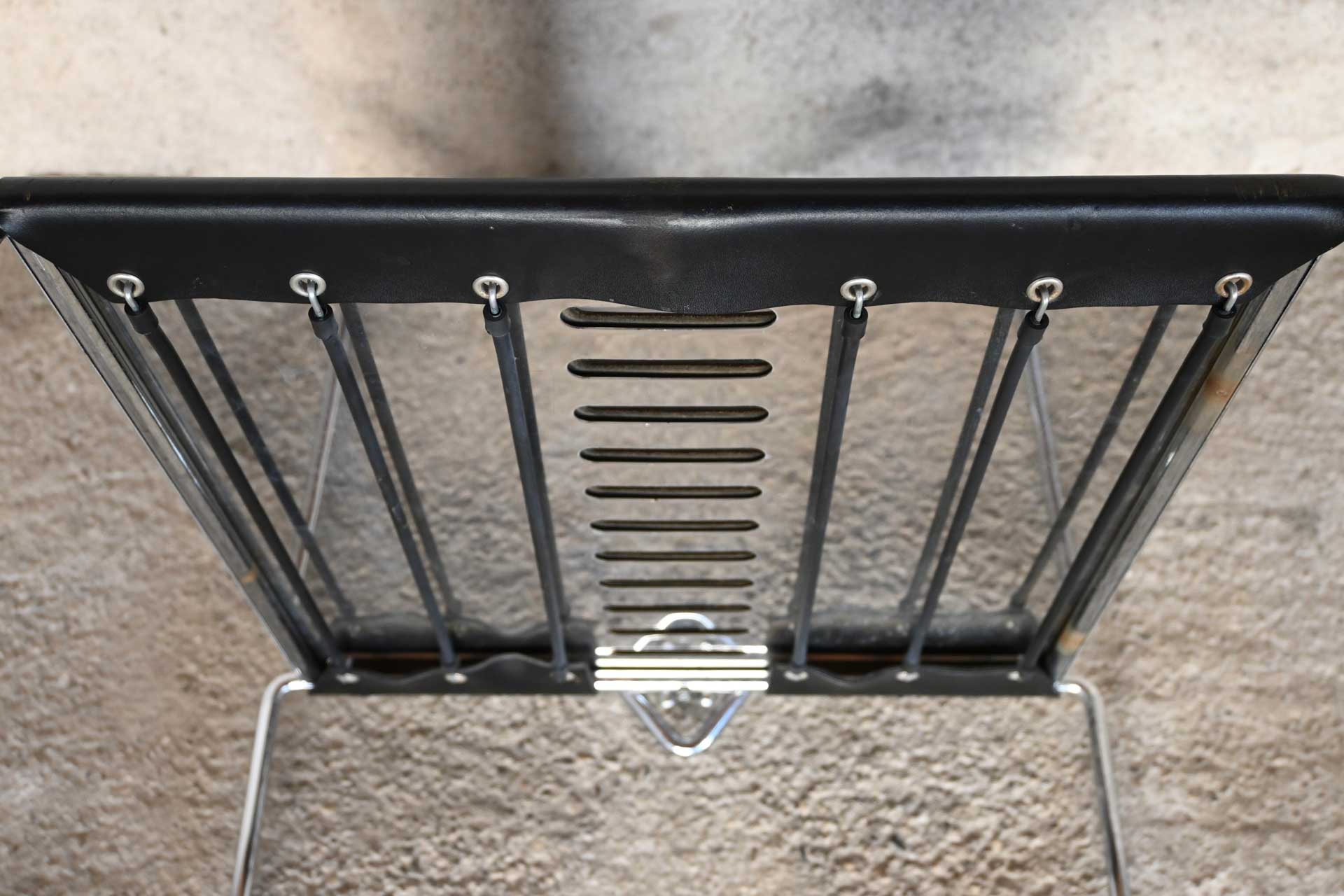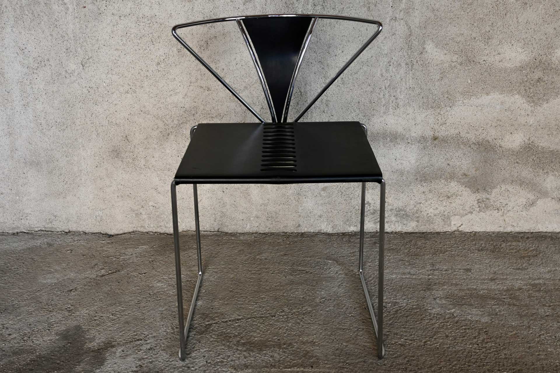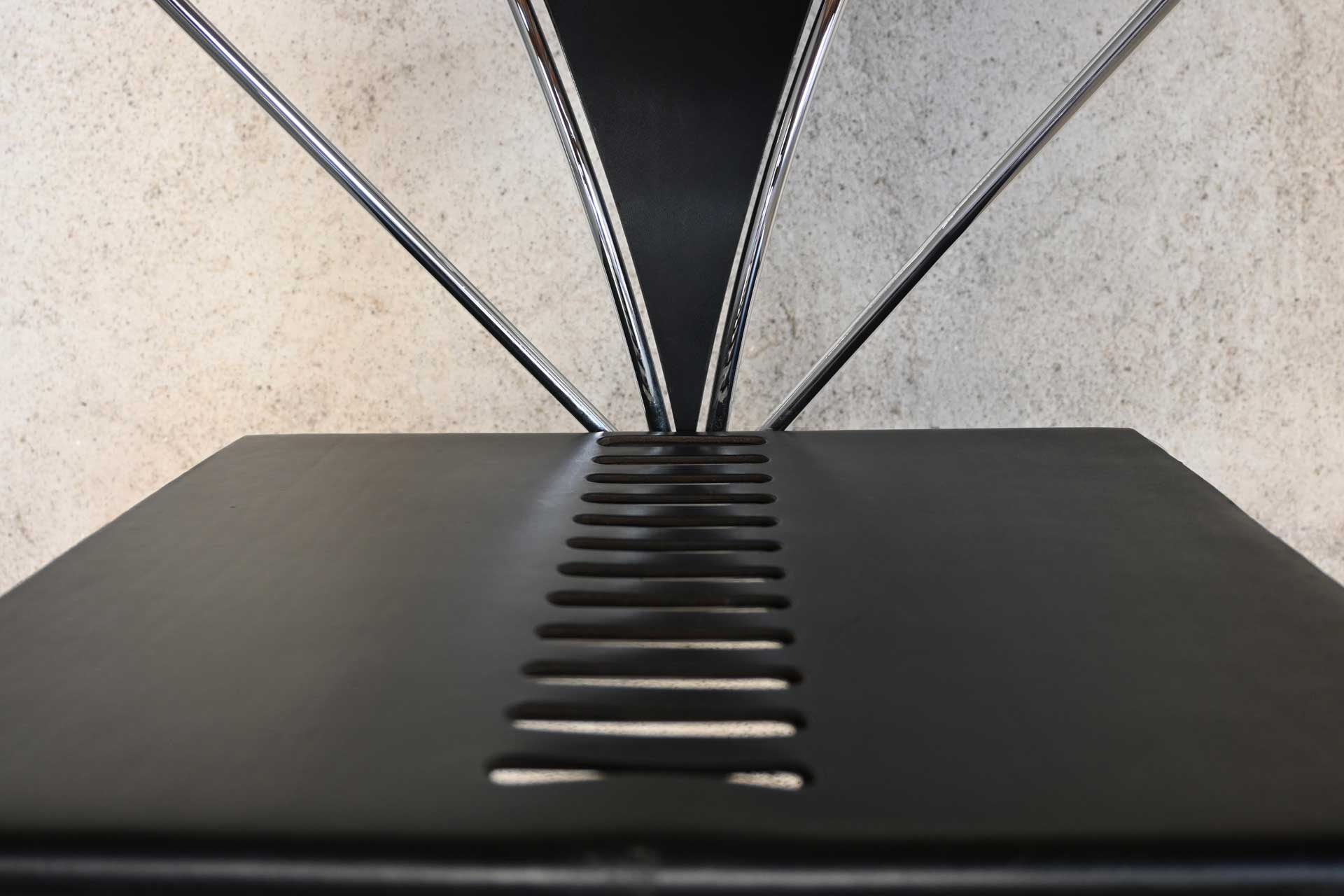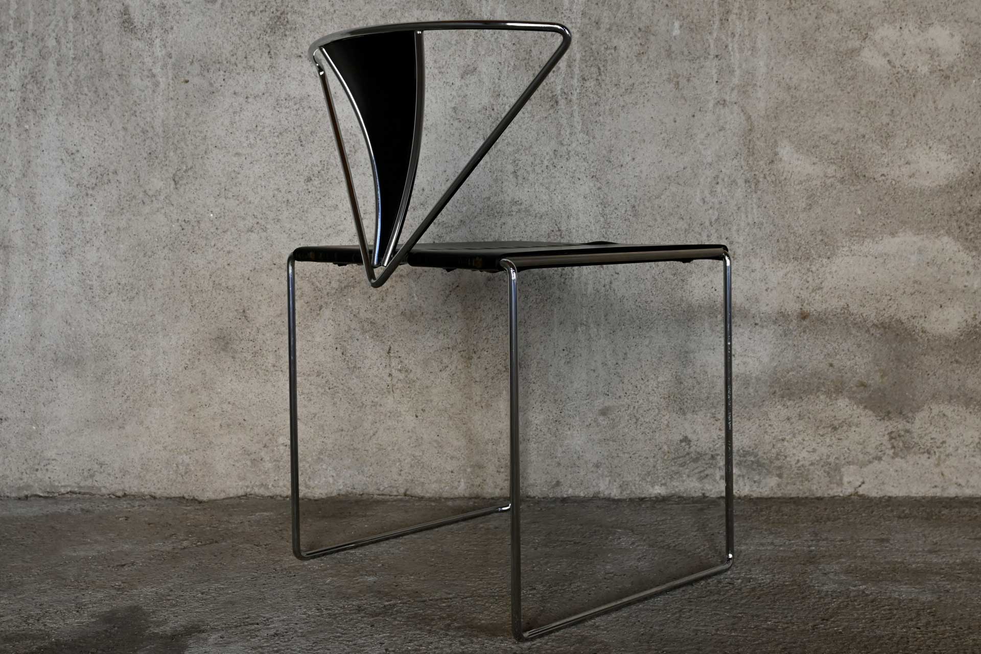 Stackable chair, Inside model, produced by Simon Gavina, designed by Kazuhide Takahama, 1991. Frame made of bent metal rod, induction-welded and chromed. Seat covered in black leather, matching the central segment of the fan-shaped backrest.