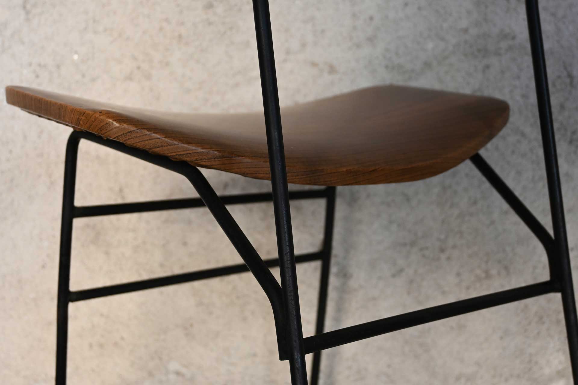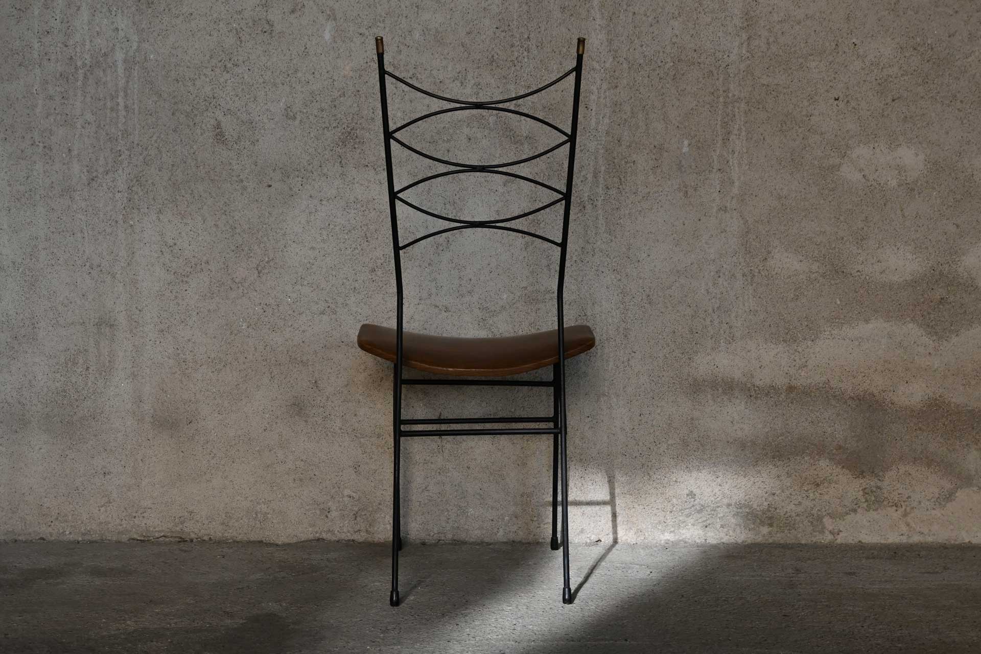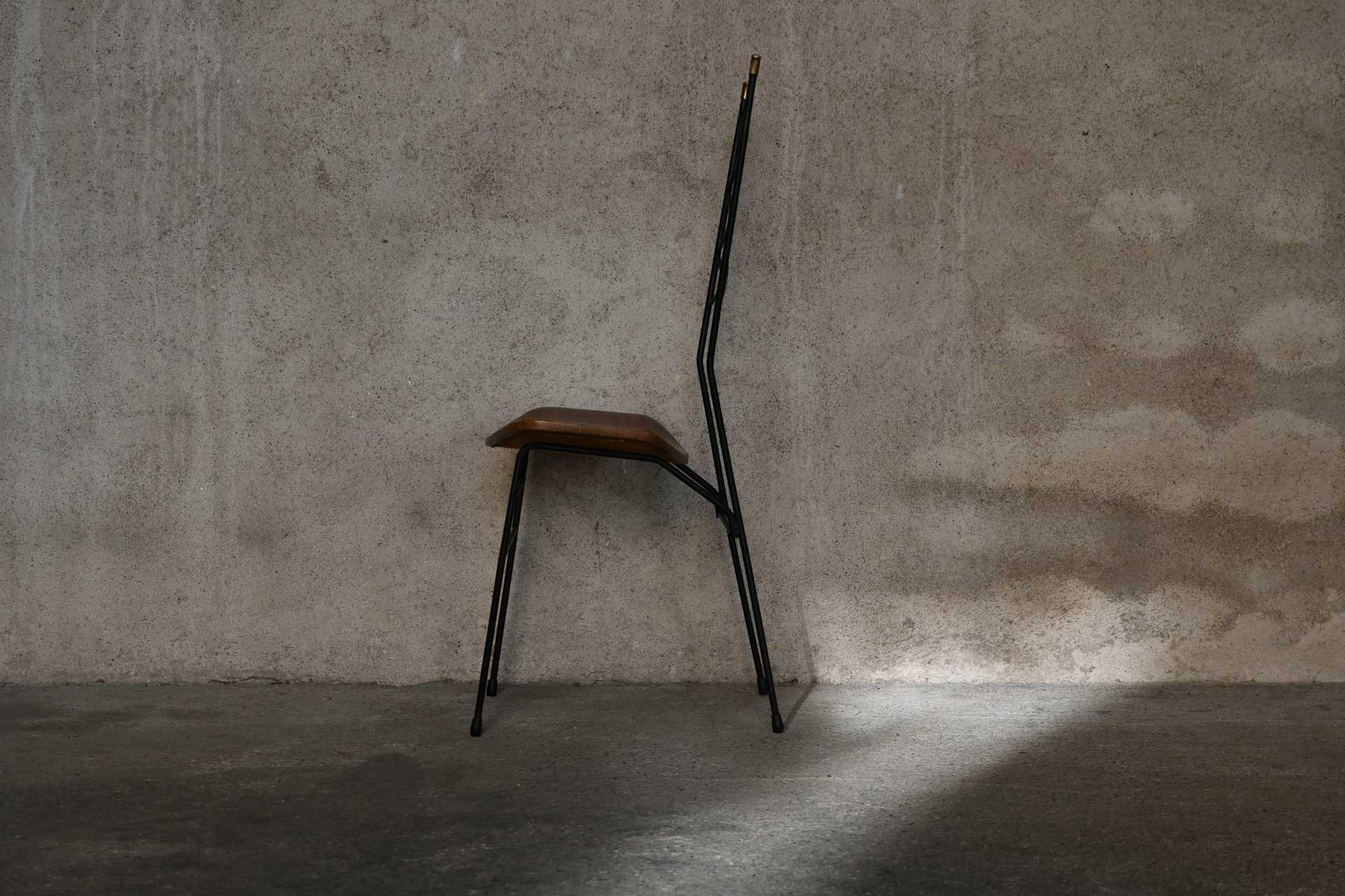 Chair produced in Italy in the fifties. Curved black painted iron rod structure, high back with brass terminals. Seat in curved plywood padded and covered in Sky wood texture.