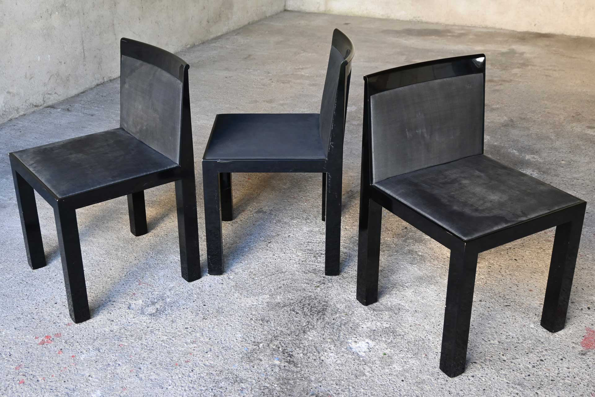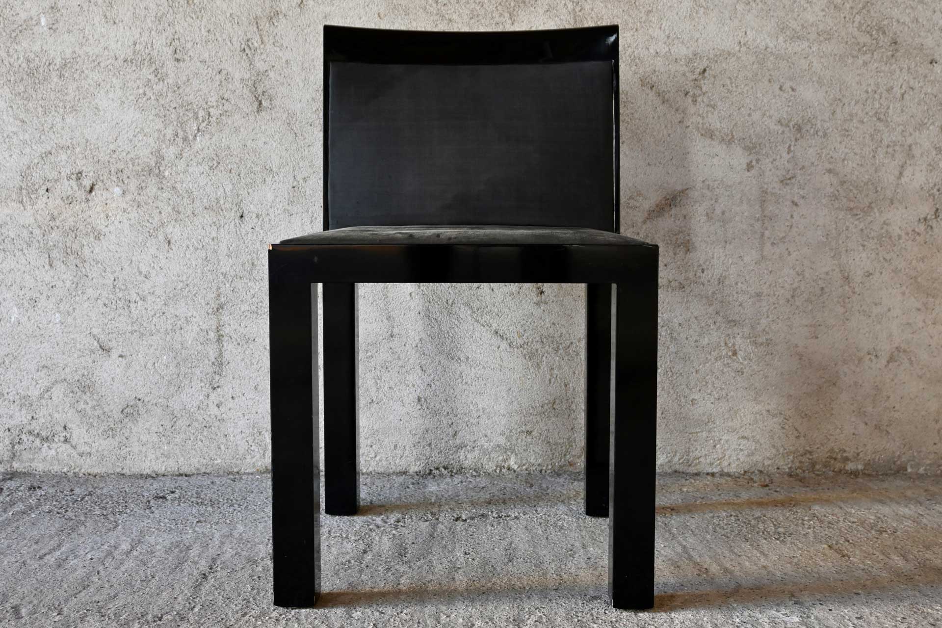 Teatro chair, Molteni, designed by Aldo Rossi and Luca Meda, 1982. Frame in black lacquered wood with a glossy polyester finish. Seat and backrest padded with polyurethane foam and upholstered in blue-grey fabric.