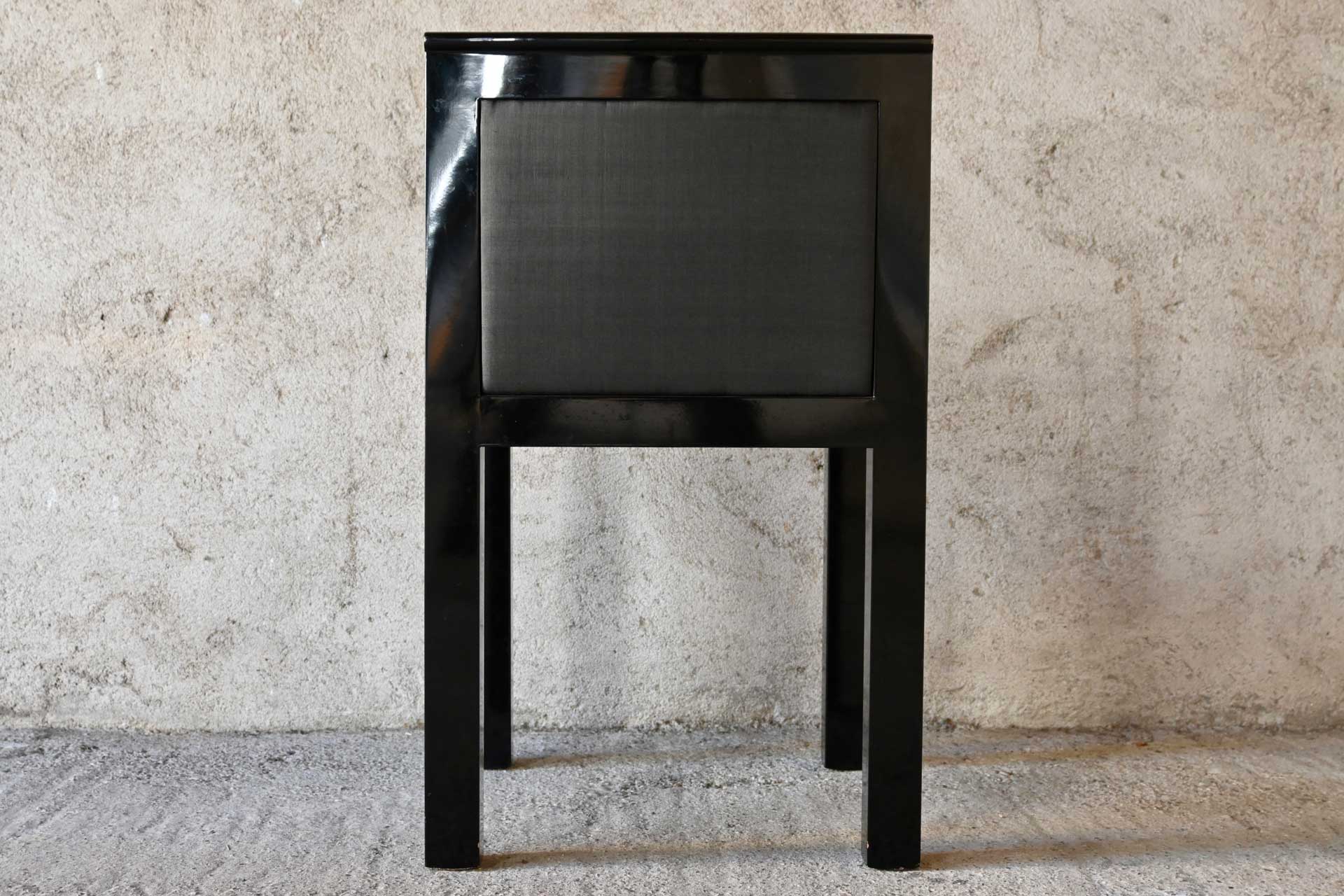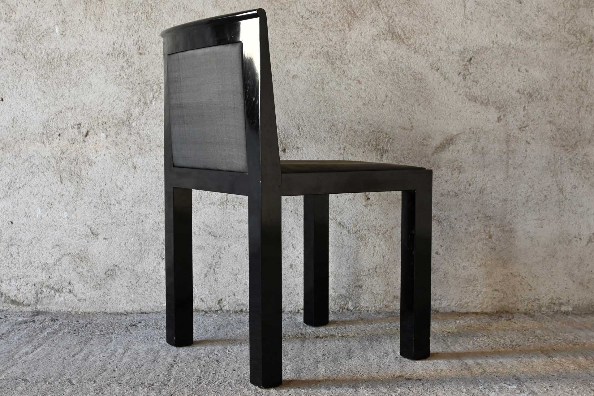 Teatro chair, Molteni, designed by Aldo Rossi and Luca Meda, 1982. Frame in black lacquered wood with a glossy polyester finish. Seat and backrest padded with polyurethane foam and upholstered in blue-grey fabric.