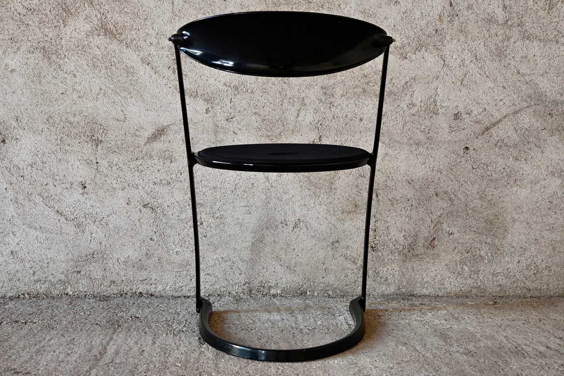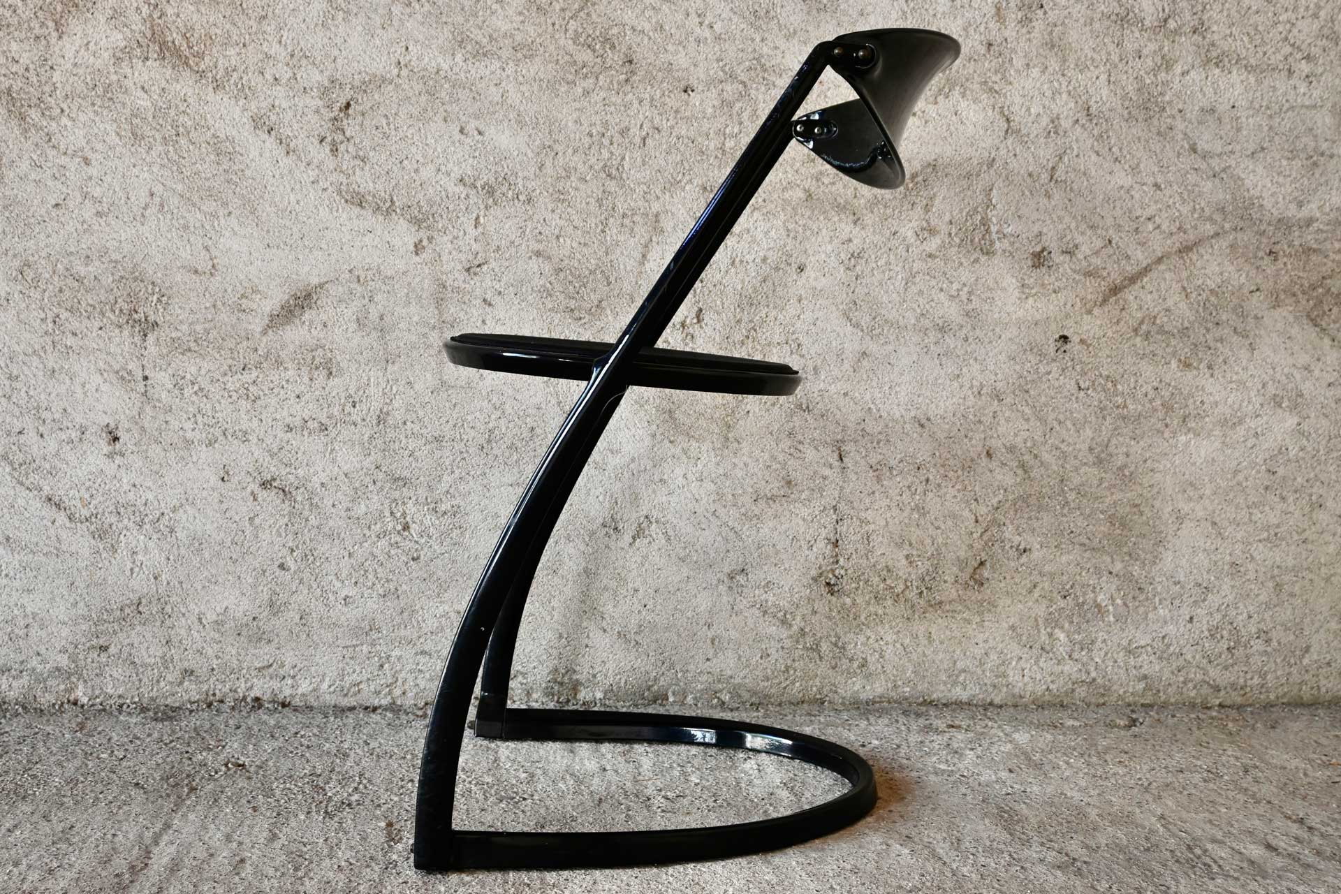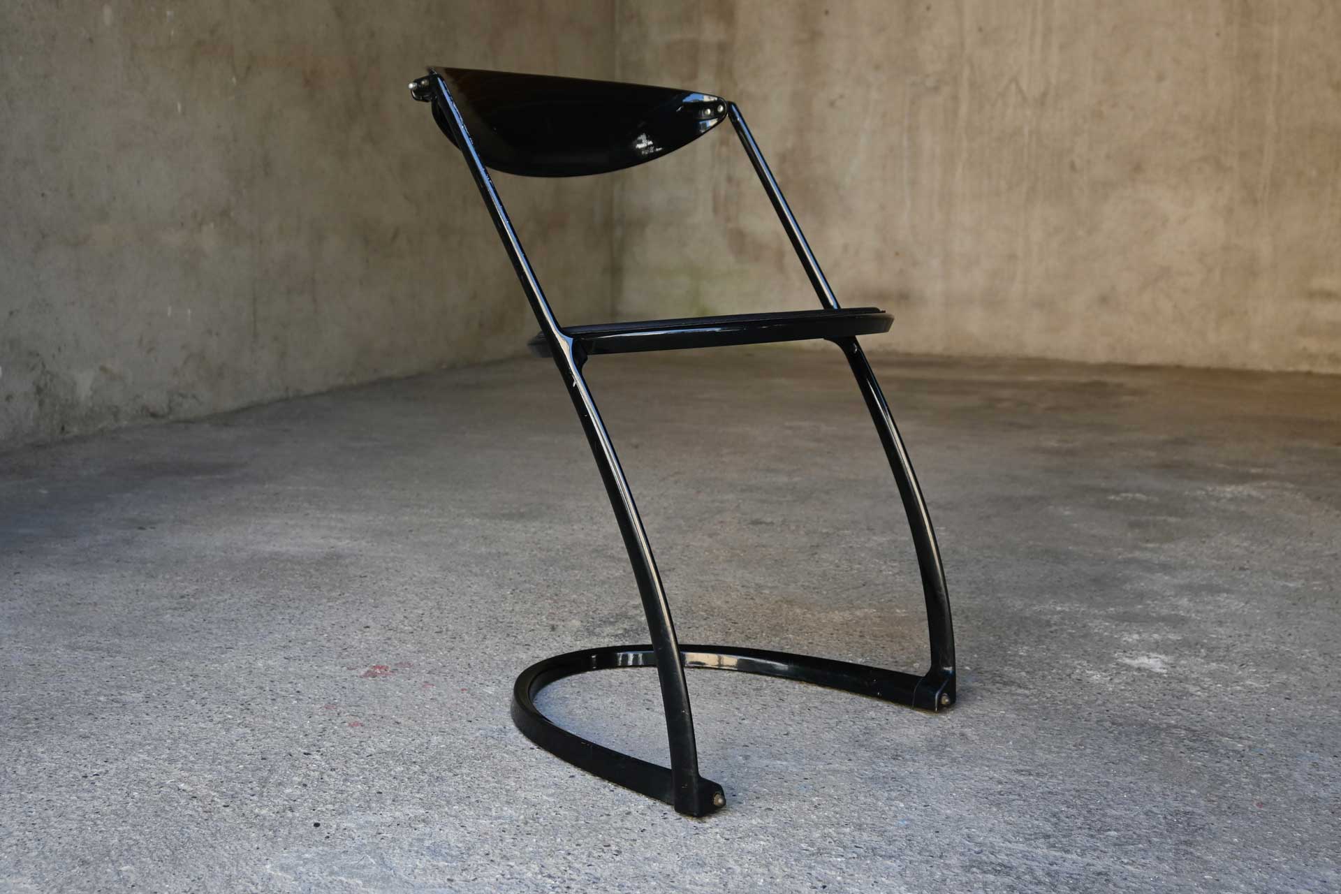 Aries stackable chair, manufactured by Nemo, designed by Claudio Cicchetti in 1994. Die-cast aluminum frame with glossy black epoxy powder coating. Thermoformed closed-cell polyethylene cushion, black elastic fabric upholstery with seat attachment hardware. Manufacturer’s and designer’s logo printed under the seat.