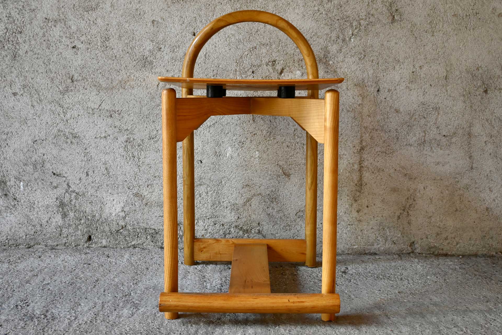 Tabù stool, manufactured by Pozzi & Verga Milano, designed by Gigi and Pepe Tanzi, 1977. Round beechwood frame that allows the leg to blend seamlessly with the backrest. Raised seat in curved plywood.
