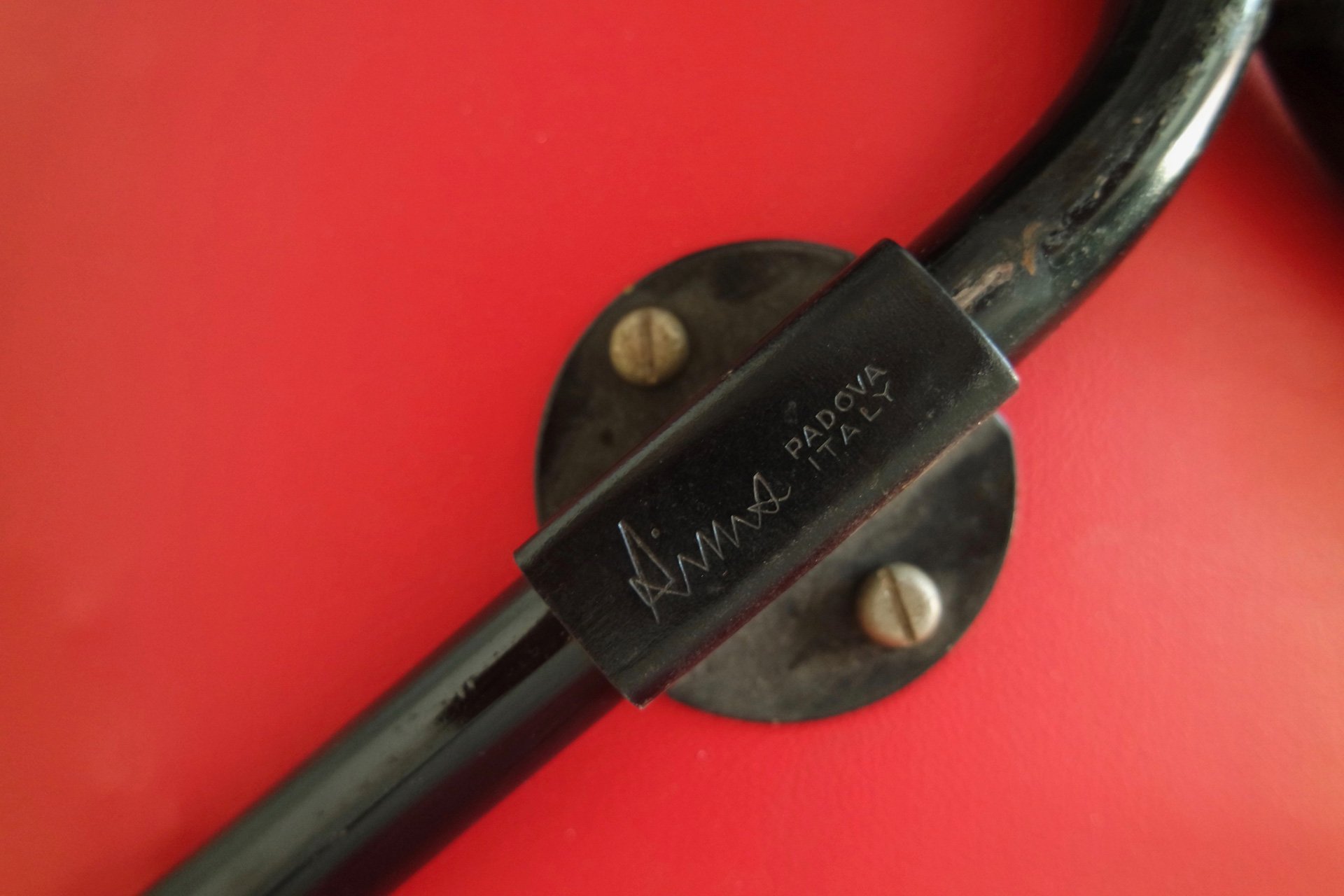 Fifties armchair produced by Rima design Gastone Rinaldi. Structure in black enamelled metal imprinted with stamped “Rima Padova Italy” logo, brass feet. Upholstered seat and back in redecorated ecological leather.