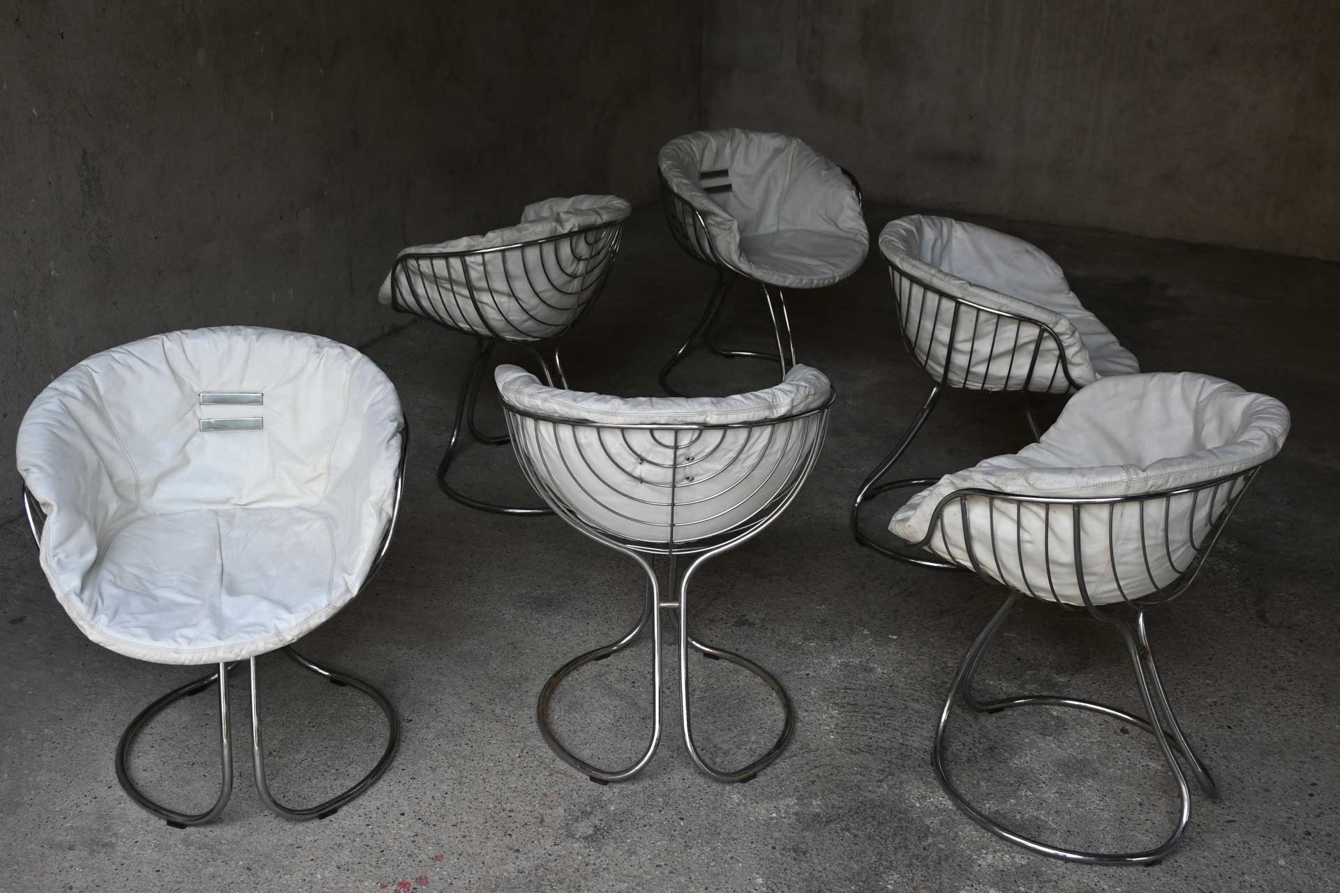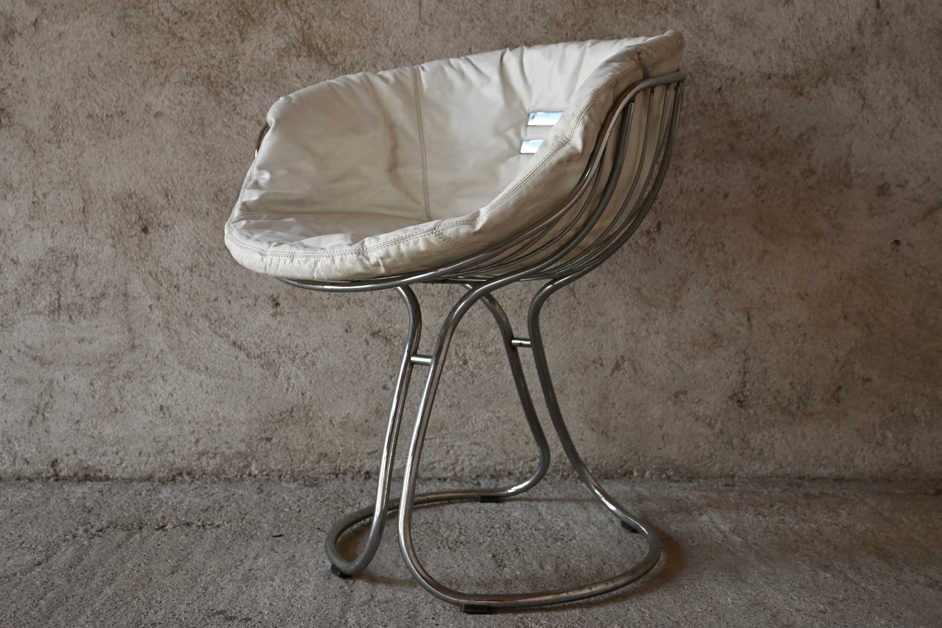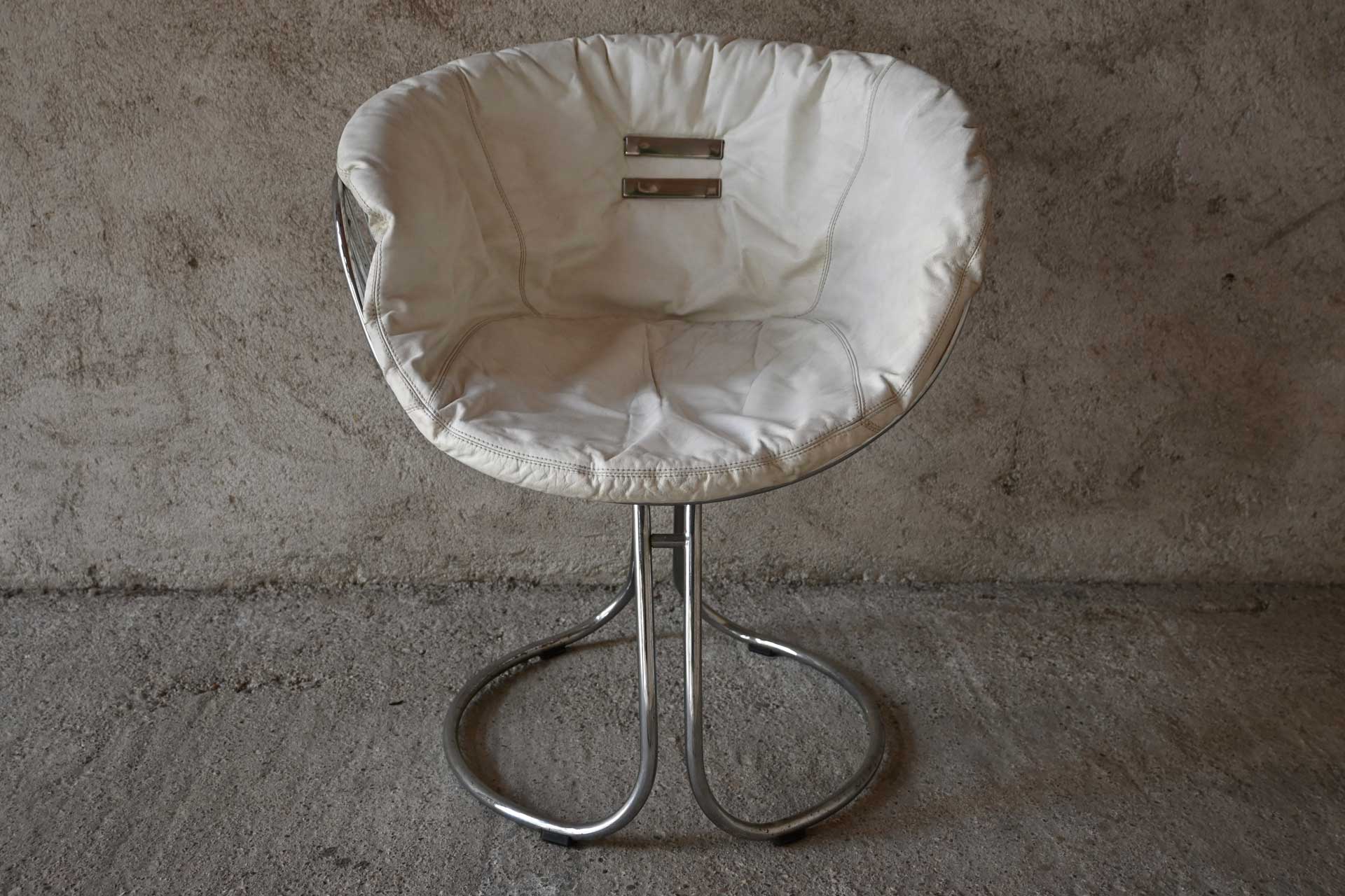 Patented armchair produced by Rima, designed by Giorgio Rinaldi, brother of Gastone Rinaldi, in 1971. Chromed metal frame consisting of two connected sections of profiled and shaped tubing. White leather cushion with two metal rivets.