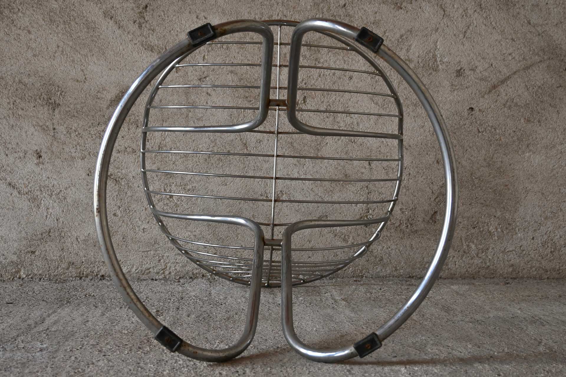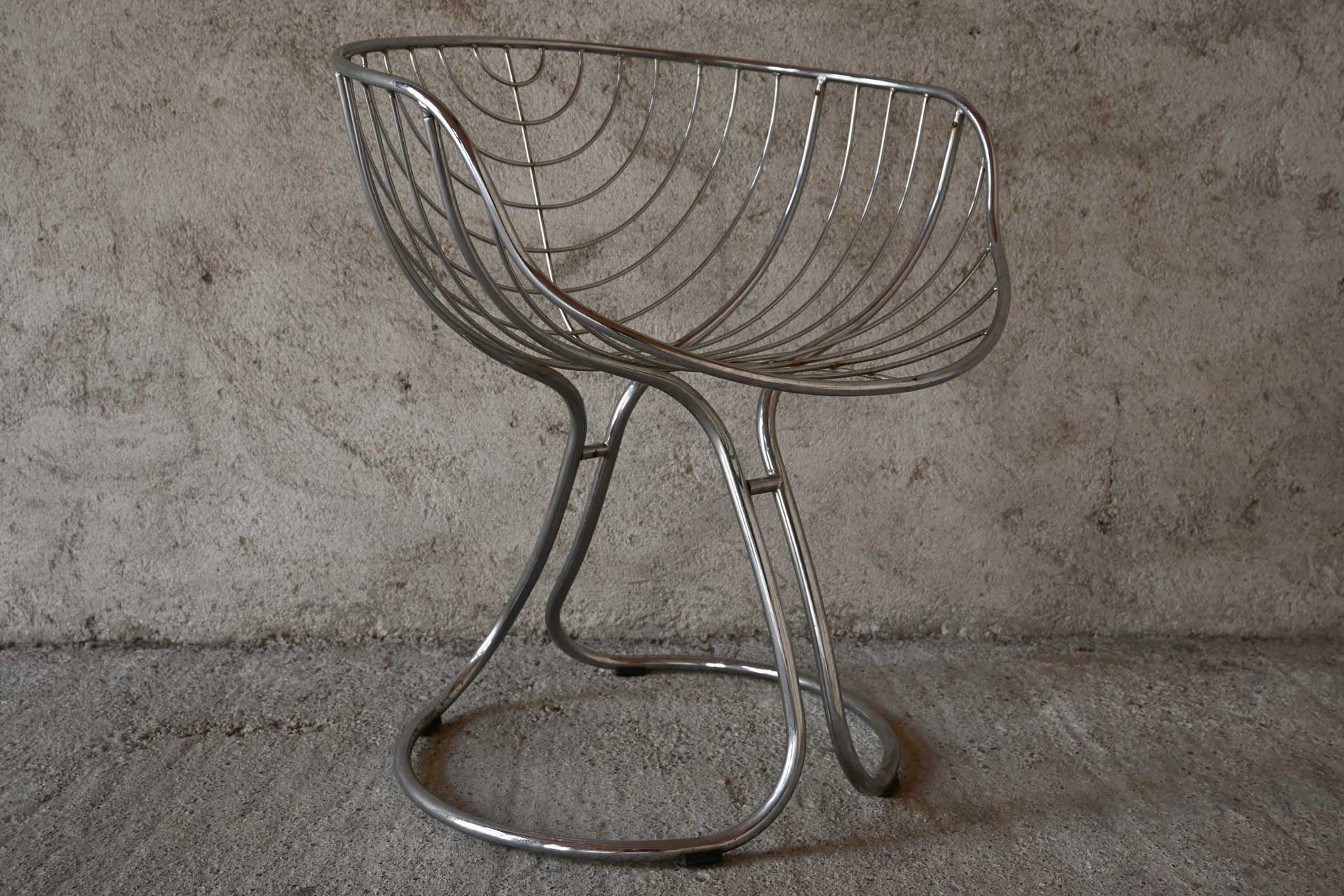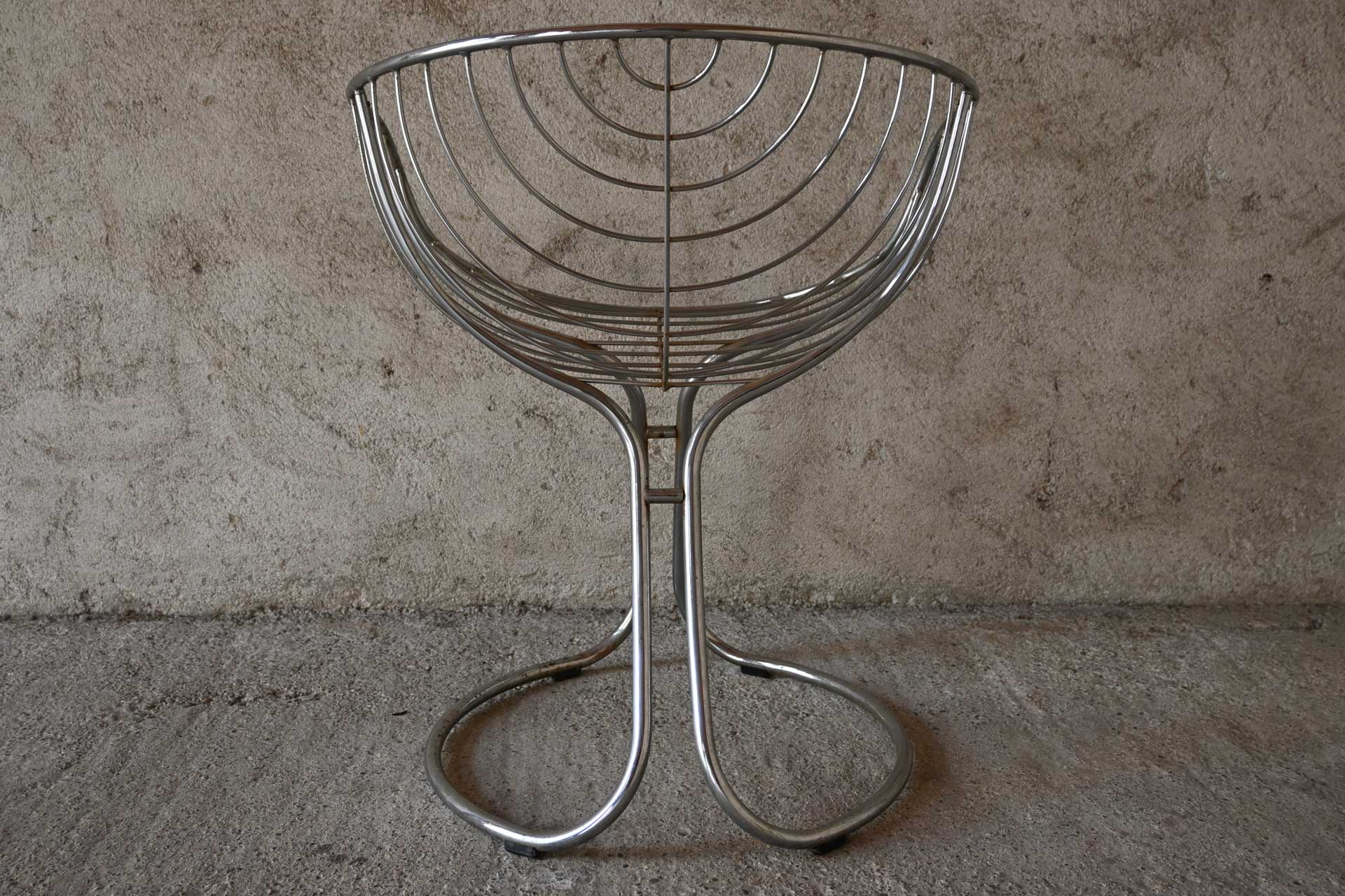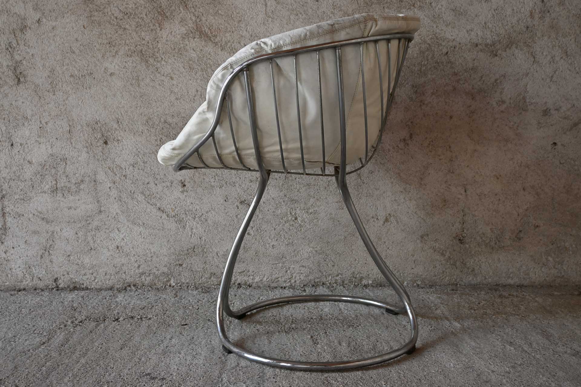 Patented armchair produced by Rima, designed by Giorgio Rinaldi, brother of Gastone Rinaldi, in 1971. Chromed metal frame consisting of two connected sections of profiled and shaped tubing. White leather cushion with two metal rivets.