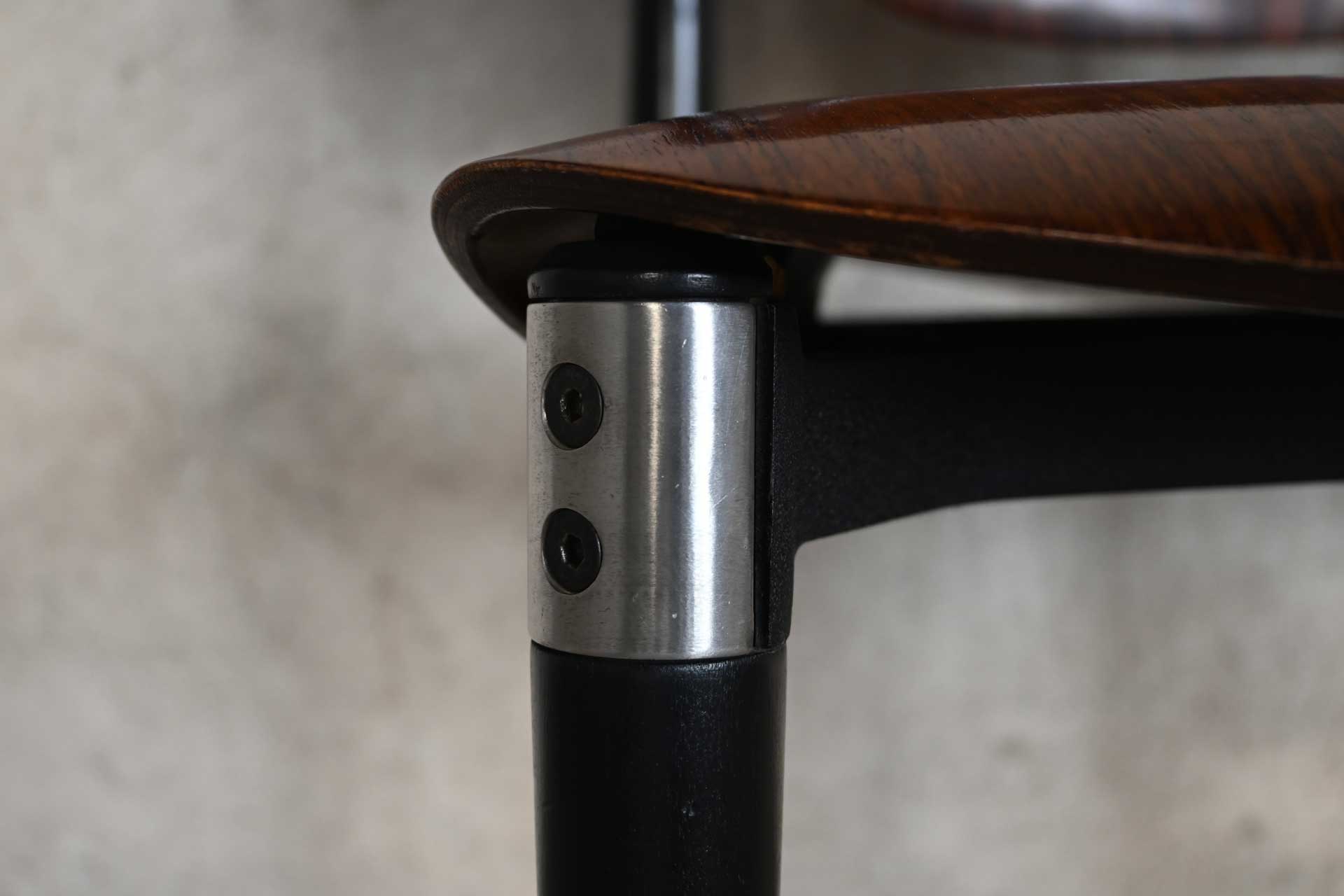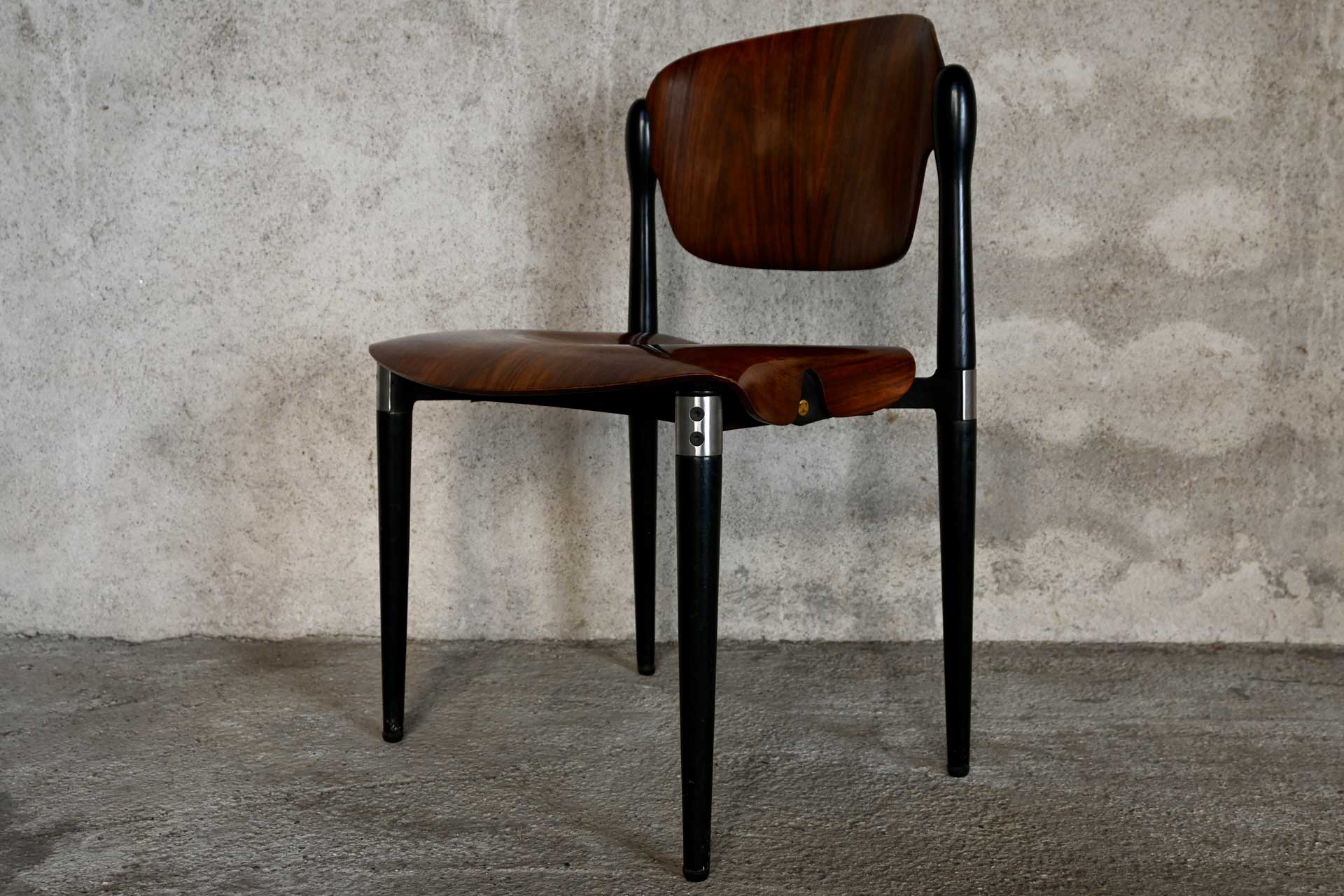 Model S83 chair, manufactured by Tecno, designed by Eugenio Gerli, 1962. Die-cast aluminum frame, seat and backrest in molded plywood and rosewood veneer. The manufacturer’s logo is engraved on the side crosspieces of the seat.