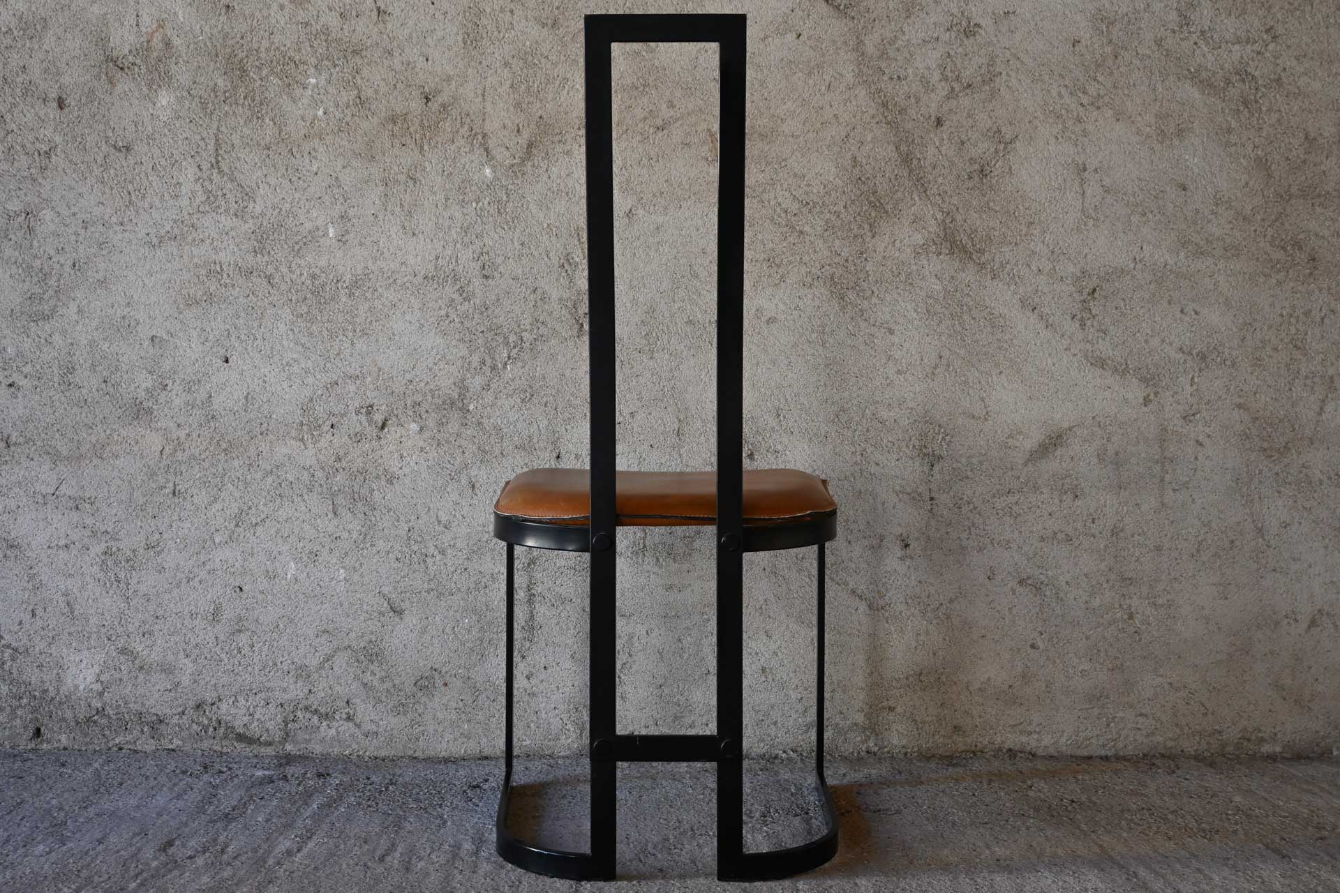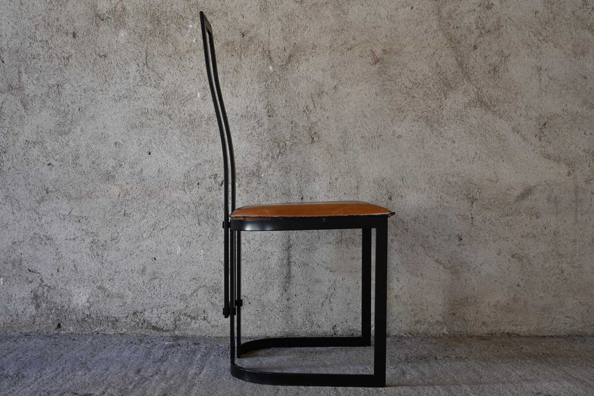 Chair by Thema, designed by Gastone Rinaldi in 1980. Black lacquered metal frame, hazelnut-colored leather upholstered seat. Manufacturer’s stamp under the seat.