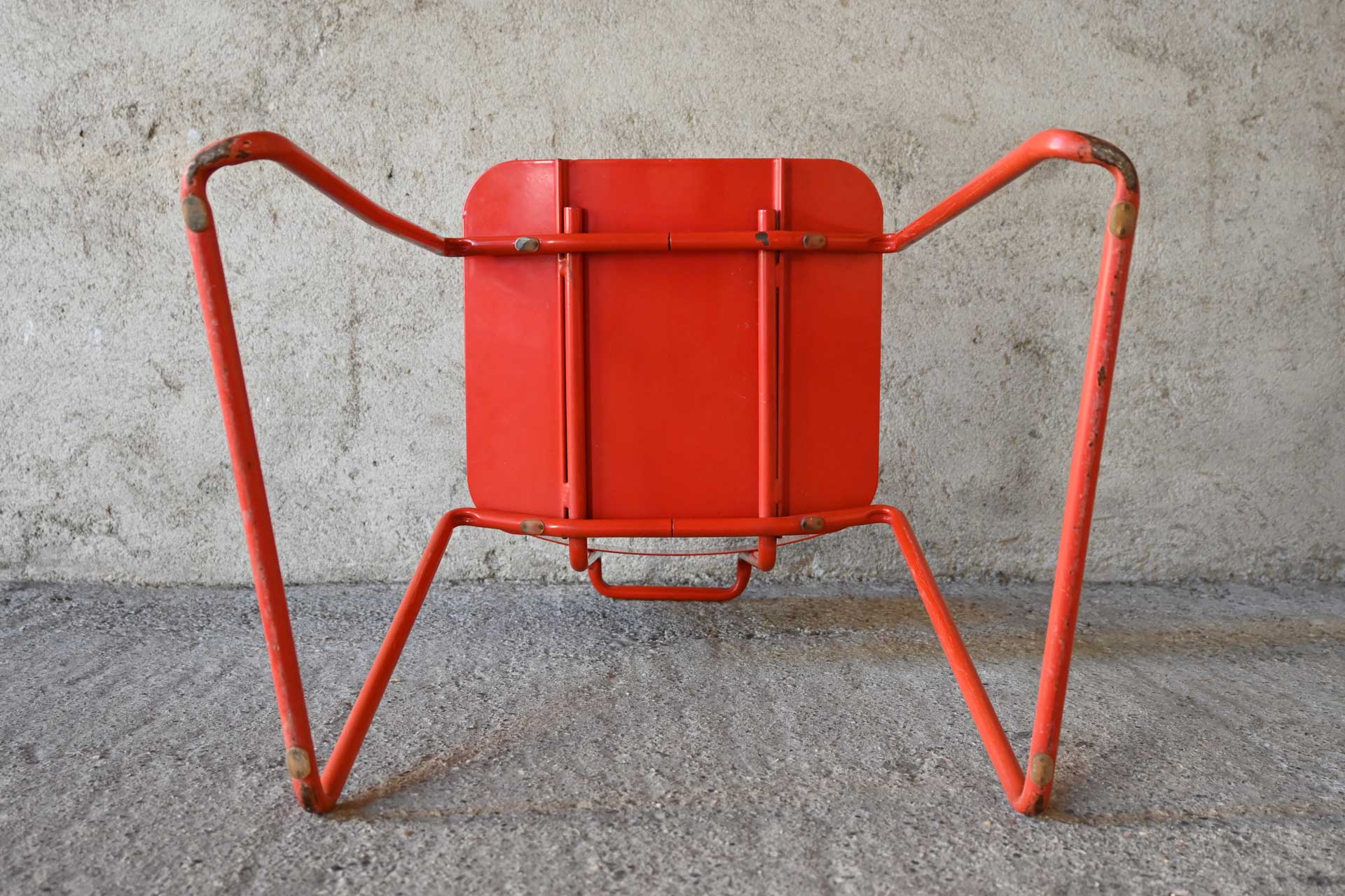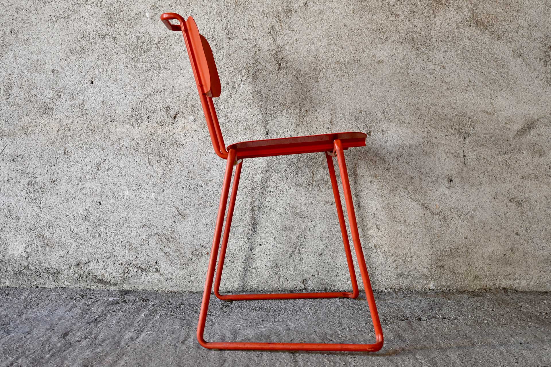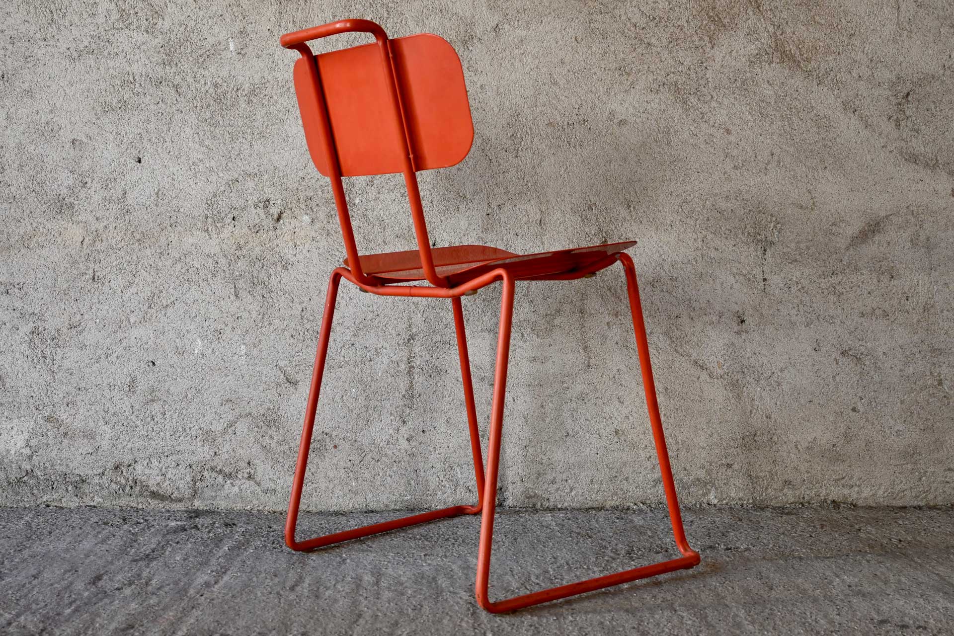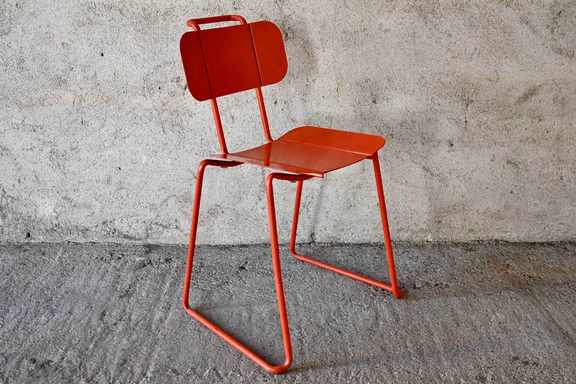 Sedia sovrapponibile modello Libra produzione Album, design Gigi e Pepe Tanzi anno 1981. Struttura in tondino di metallo, sedile e schienale in fogli di lamiera curvati e piegati, il tutto verniciato di rosso. Il telaio che sorregge lo schienale forma anche una maniglia per sollevare la sedia.
