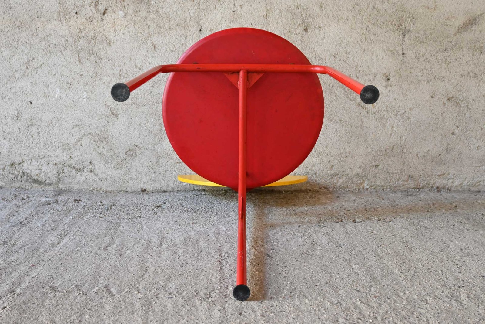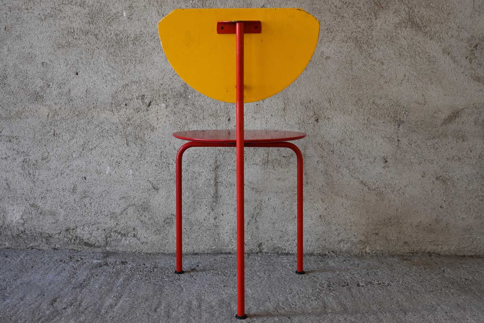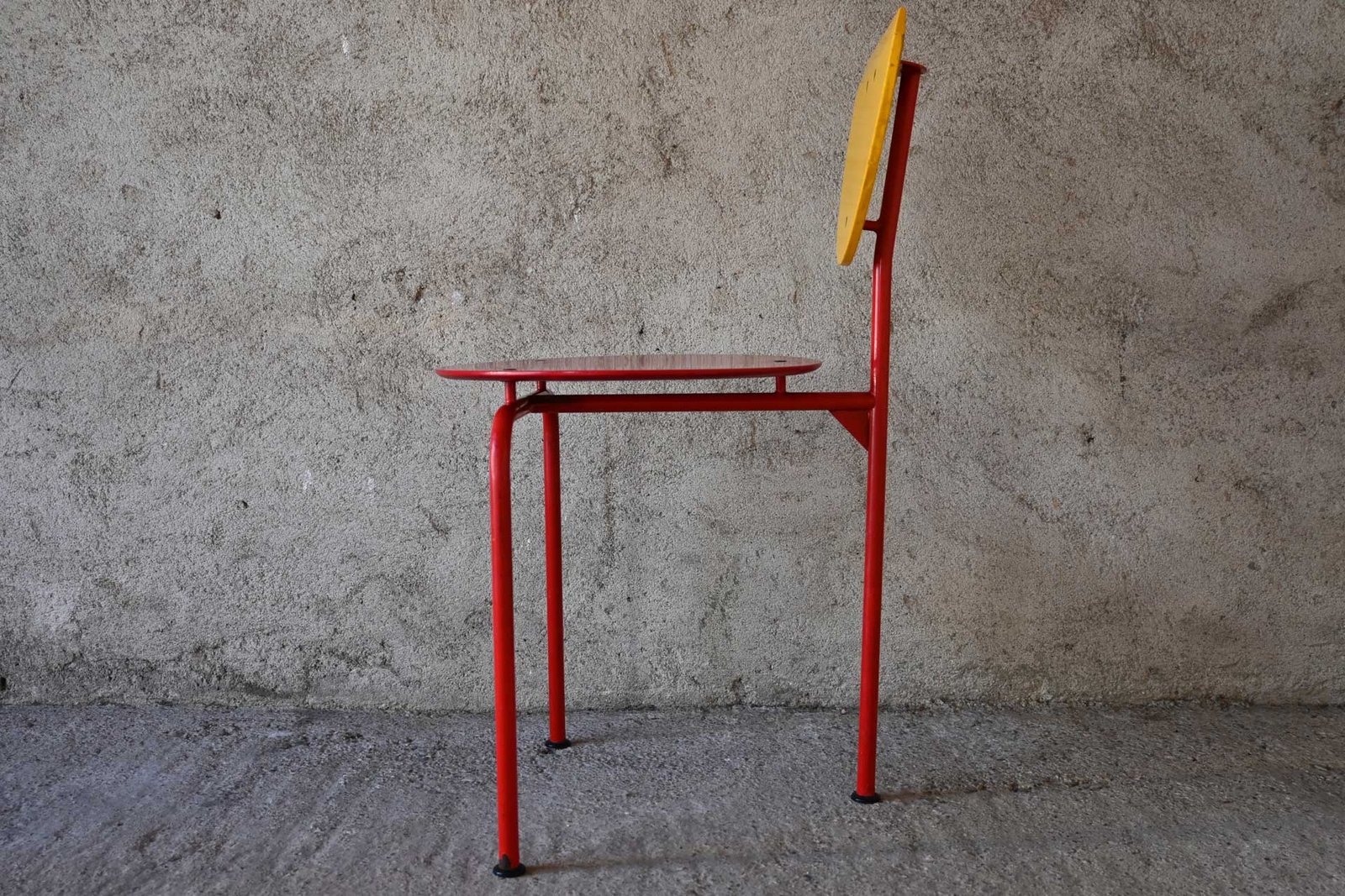 Sedia impilabile modello Alien produzione Alias collezione Dulwich design Carlo Forcolini, anno 1980. Struttura in tubolare d’acciaio verniciato di colore rosso e giallo. Sedile e schienale in multistrato di obeche dai colori alternati alla struttura.