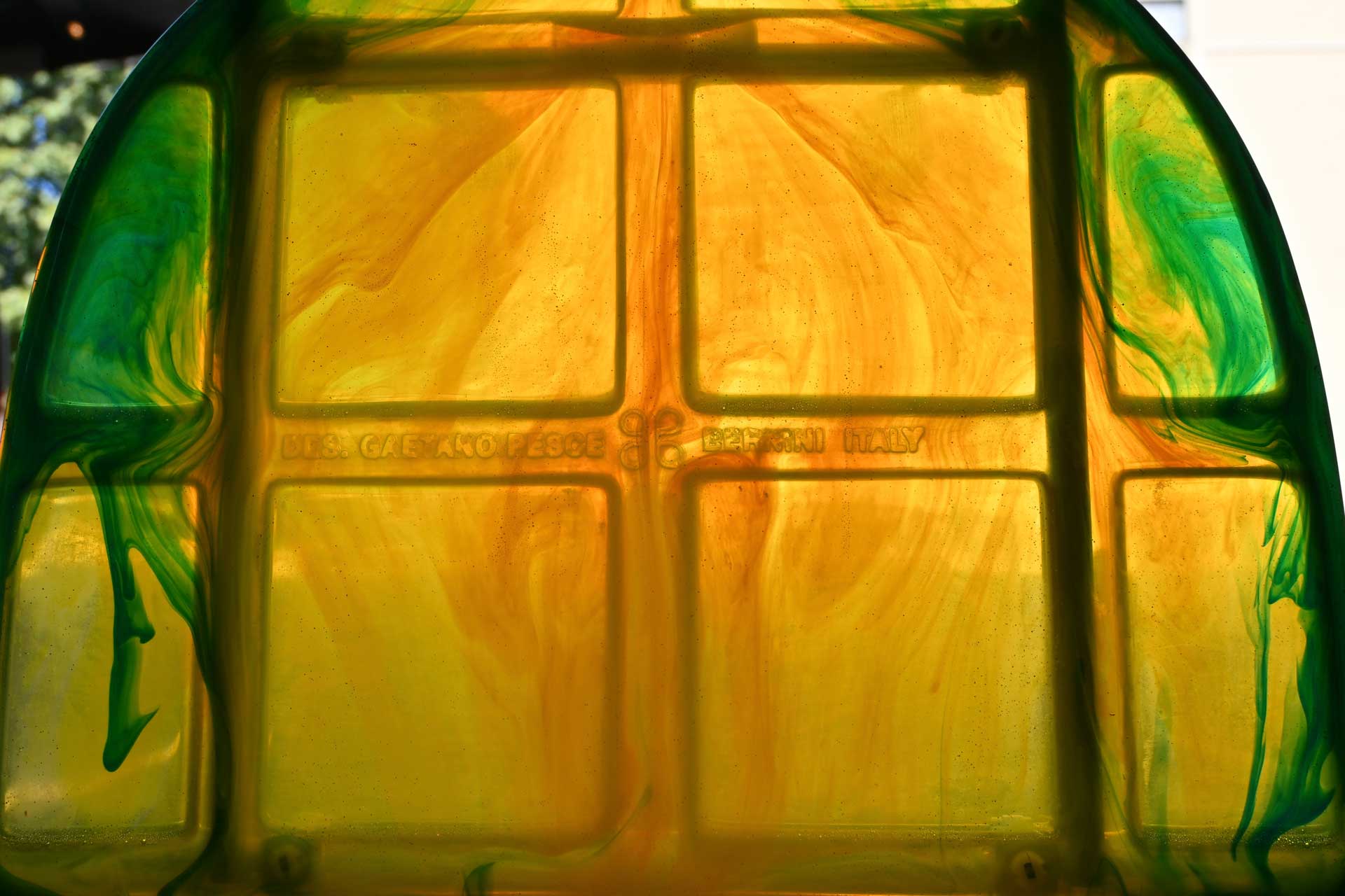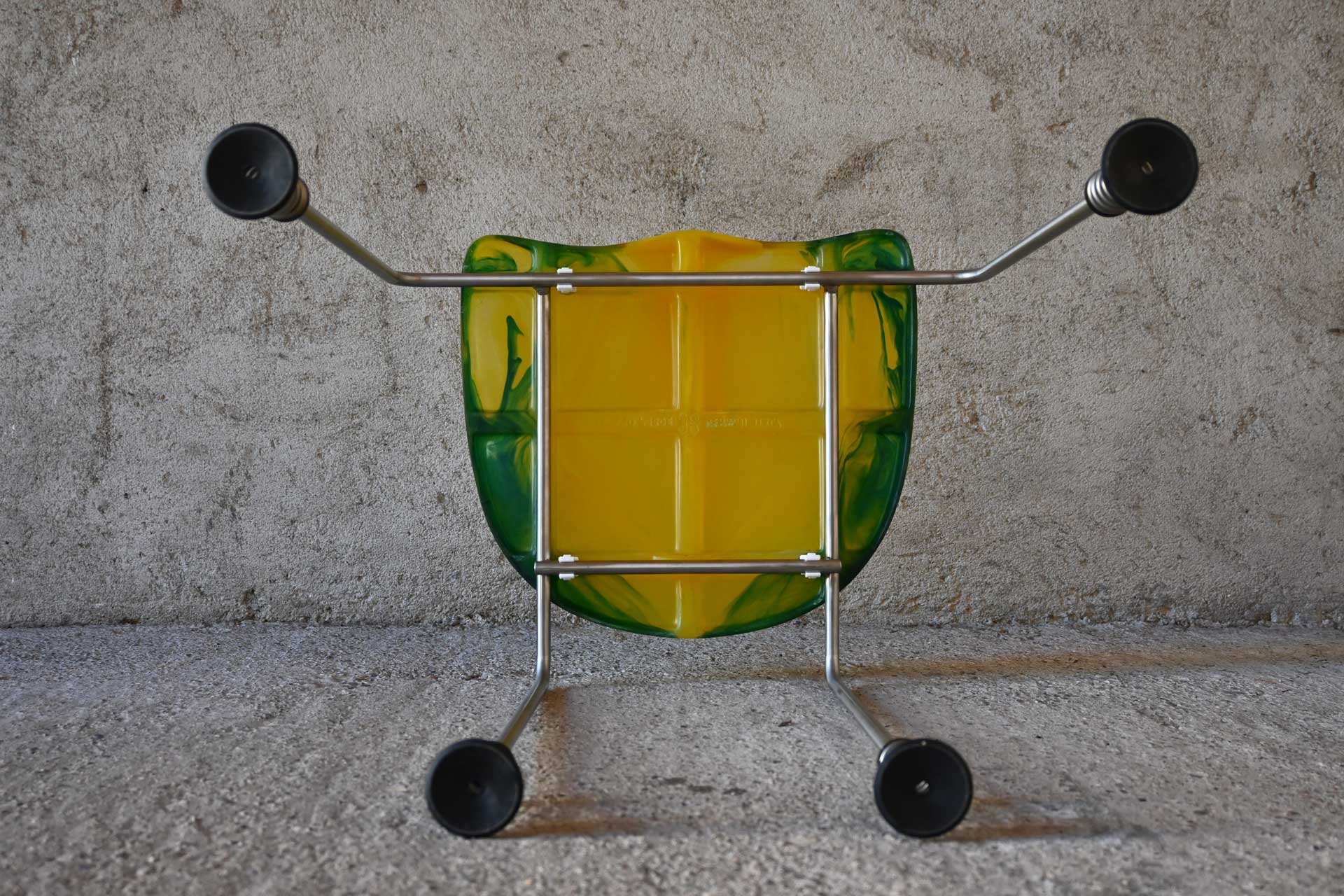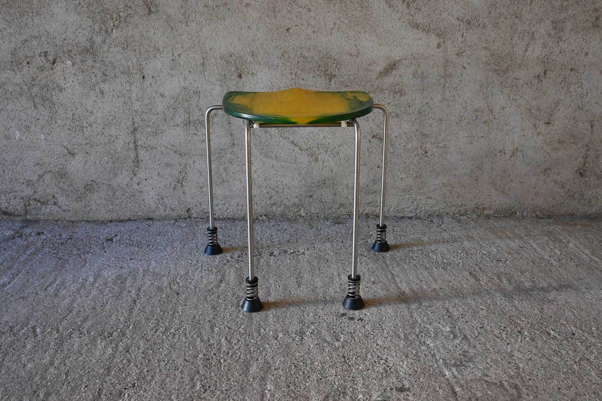 Sgabello modello 543 Broadway produzione Bernini design Gaetano Pesce anno 1993. Struttura in metallo oscillante, piedi con molle in acciaio e supporti in nylon nero. Seduta in resina epossidica nei toni del giallo e del verde, colata manualmente in stampi con effetto di elaborazione del colore di volta in volta diverso.