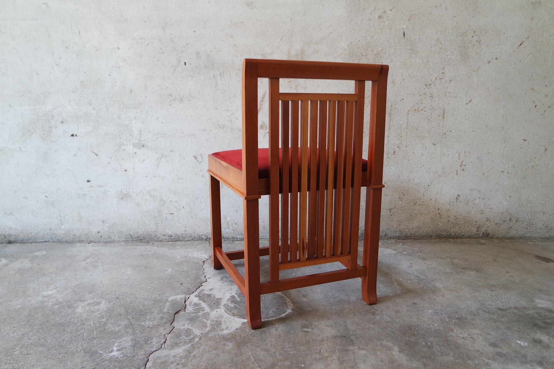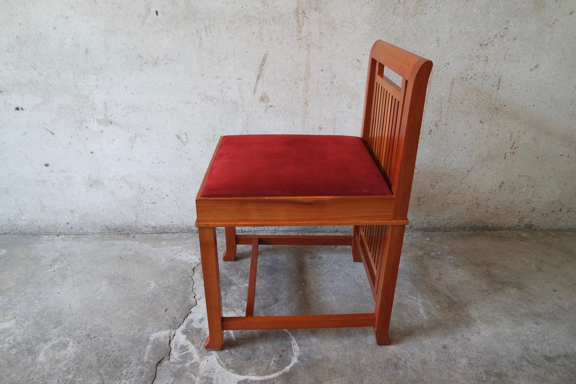 Sedie con struttura in ciliegio naturale e schienale basso a listelli, sedile imbottito in poliuretano espanso e rivestito in tessuto color rosso.