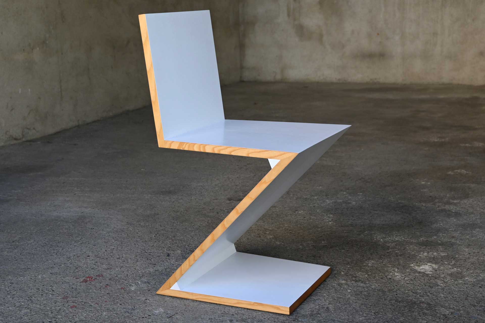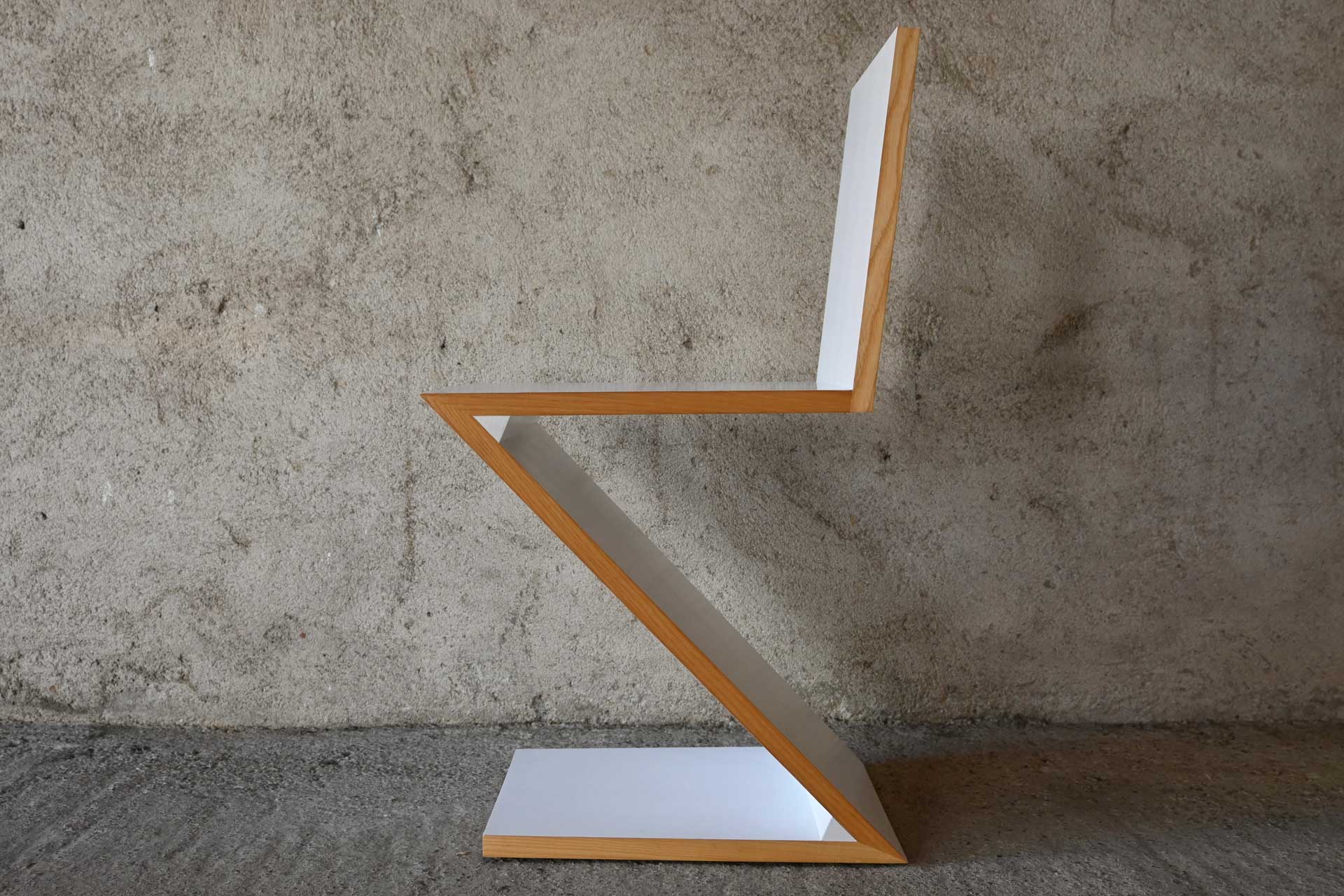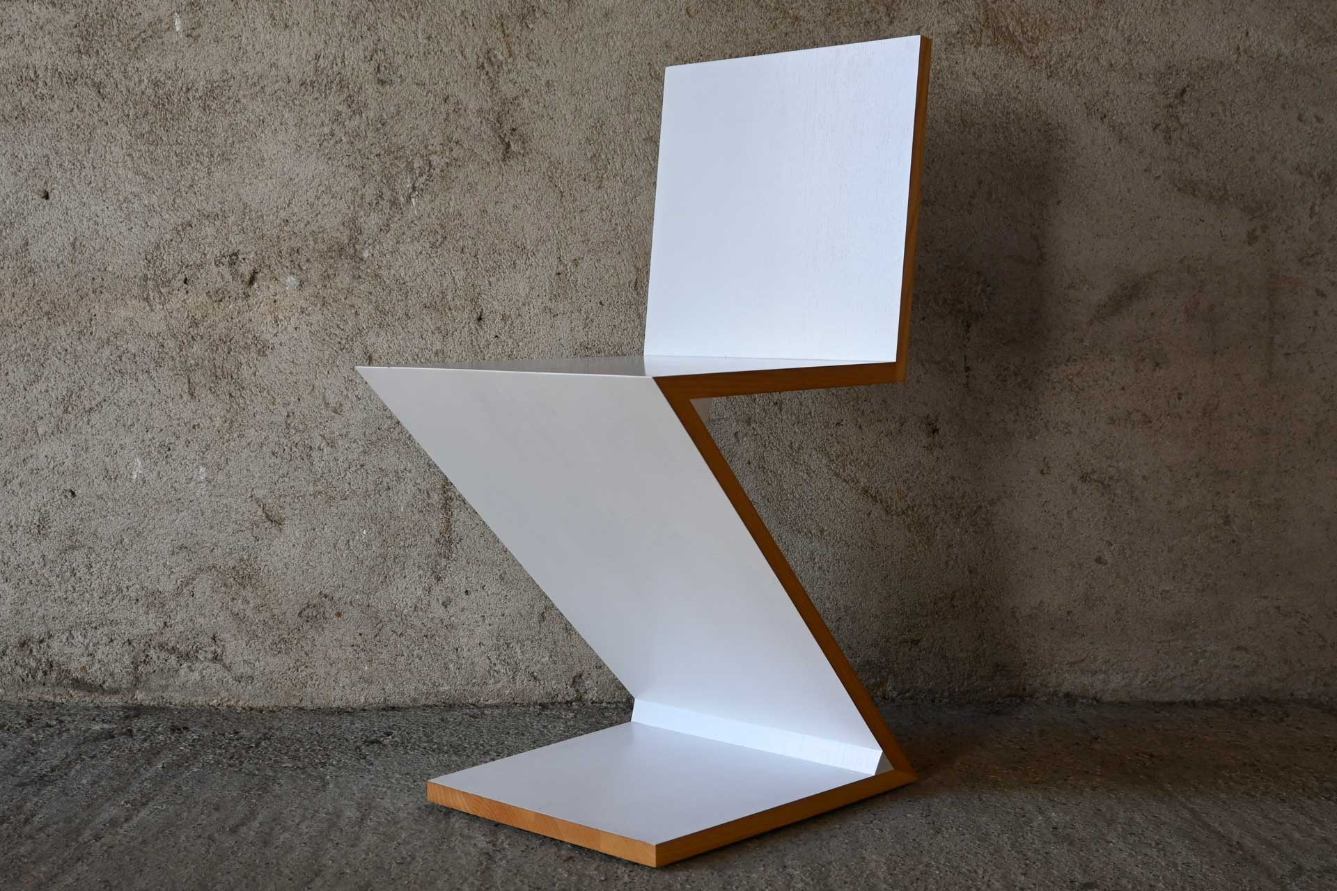 Sedia modello 280 Zig Zag produzione I Maestri Cassina, anno 1973 design Gerrit Thomas Rietveld anno 1934. Struttura a sbalzo formata da un foglio continuo in massello di legno di frassino a forma di zeta rovesciata. Sedia di colore bianco a poro aperto e sezioni laterali lasciate naturali, timbro della manifattura sotto la base.