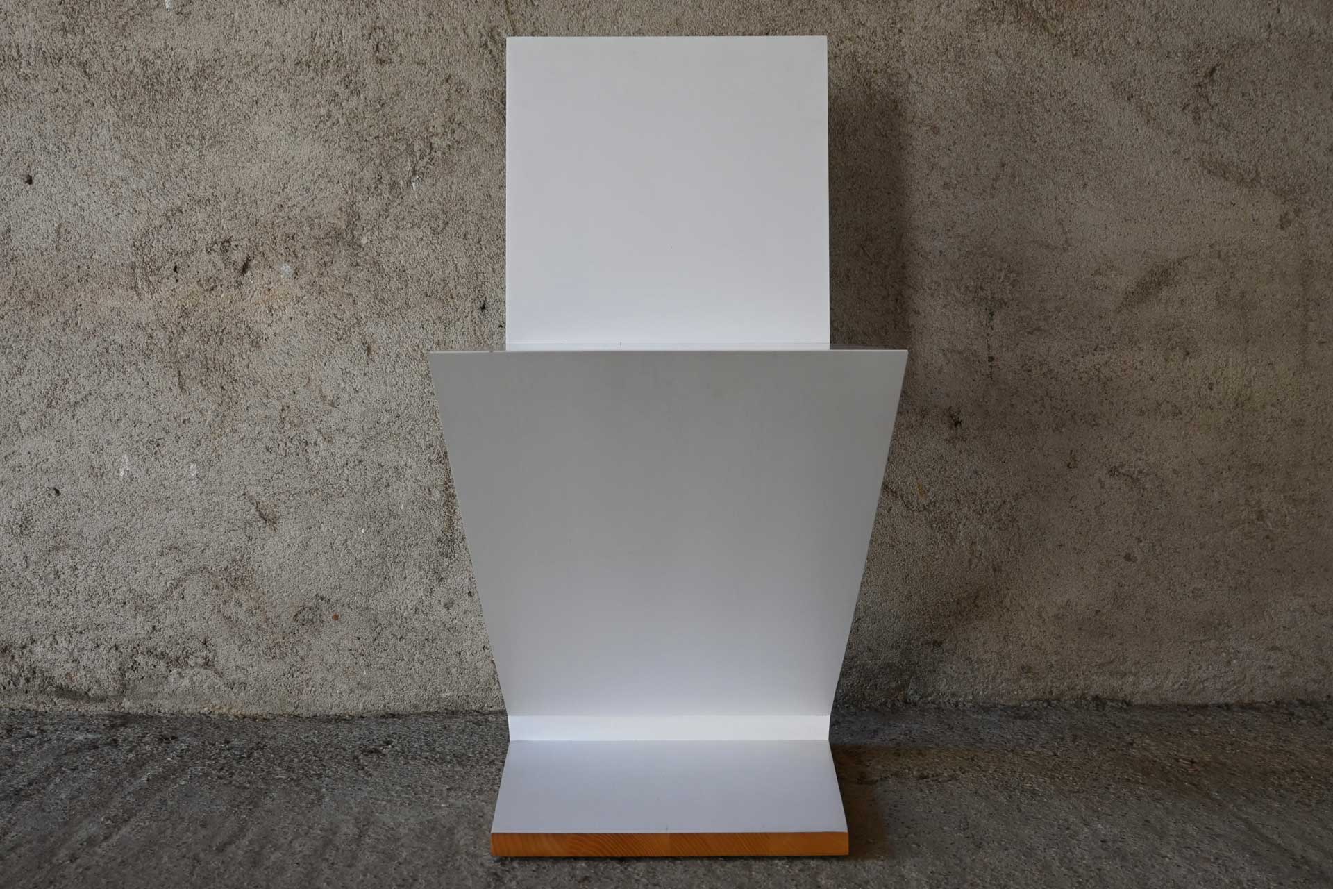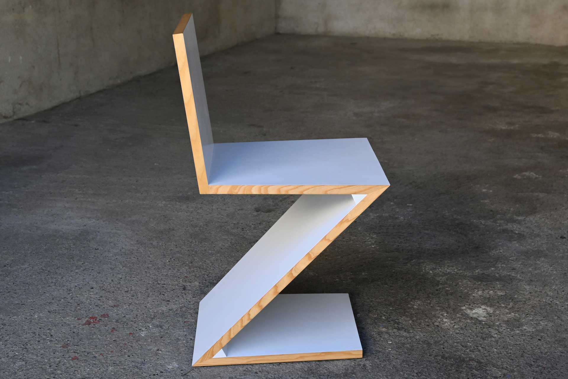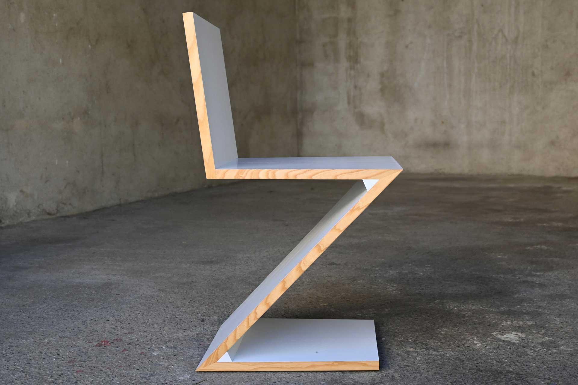 Sedia modello 280 Zig Zag produzione I Maestri Cassina, anno 1973 design Gerrit Thomas Rietveld anno 1934. Struttura a sbalzo formata da un foglio continuo in massello di legno di frassino a forma di zeta rovesciata. Sedia di colore bianco a poro aperto e sezioni laterali lasciate naturali, timbro della manifattura sotto la base.