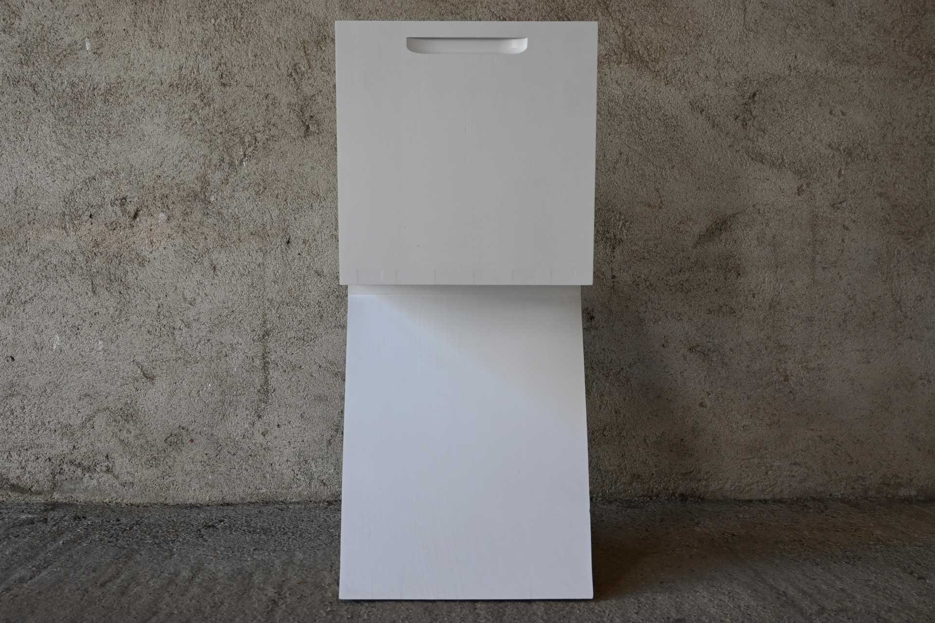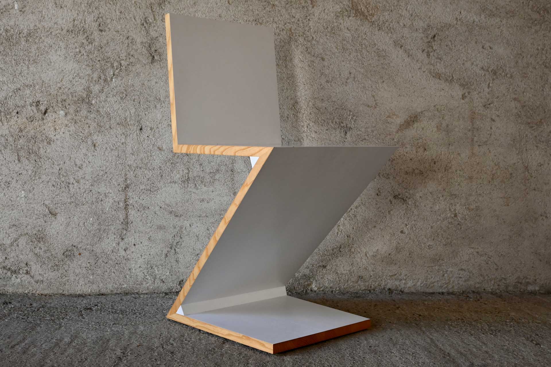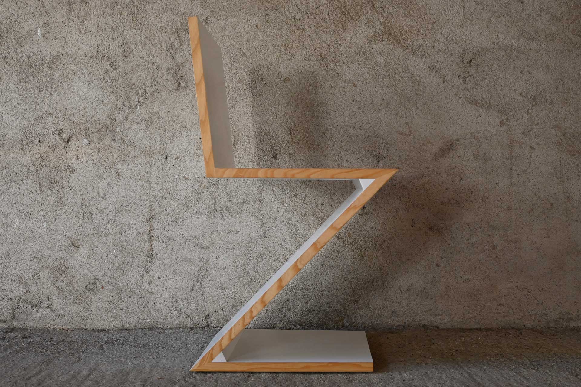 Sedia modello 280 Zig Zag produzione I Maestri Cassina, anno 1973 design Gerrit Thomas Rietveld anno 1934. Struttura a sbalzo formata da un foglio continuo in massello di legno di frassino a forma di zeta rovesciata. Sedia di colore bianco a poro aperto e sezioni laterali lasciate naturali, timbro della manifattura sotto la base.