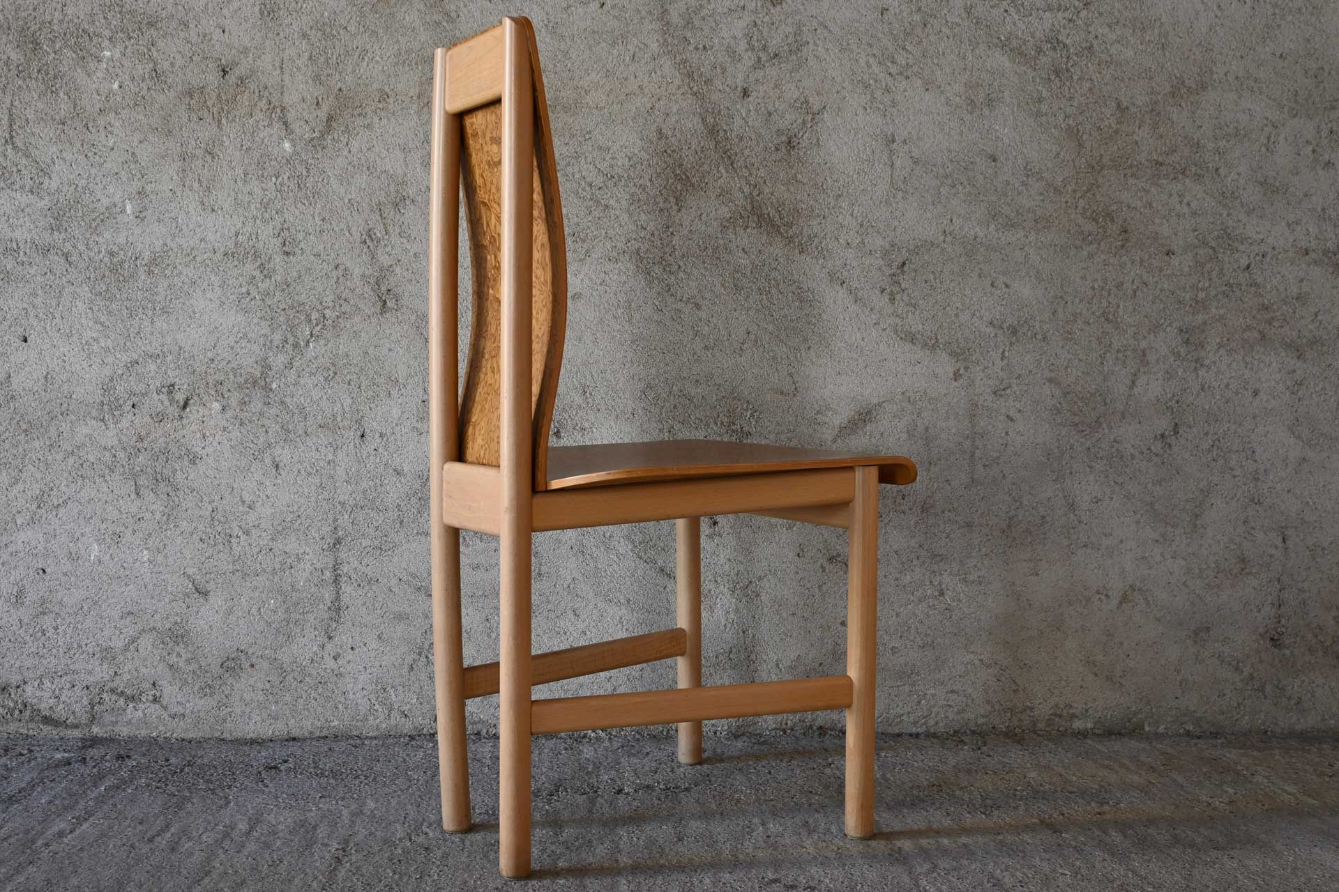 Sedia produzione Driade design Enzo Mari modello Vela, anno 1981. Struttura in legno di faggio chiaro, seduta e schienale in compensato curvato rivestito in radica.