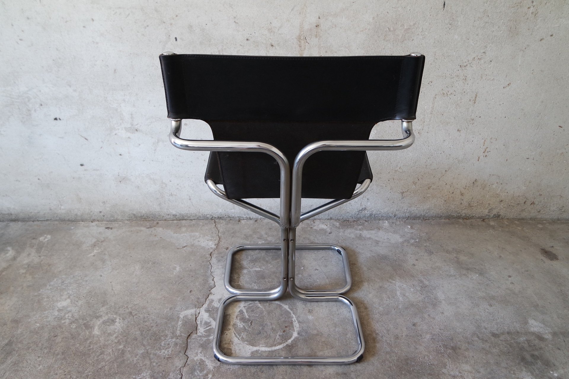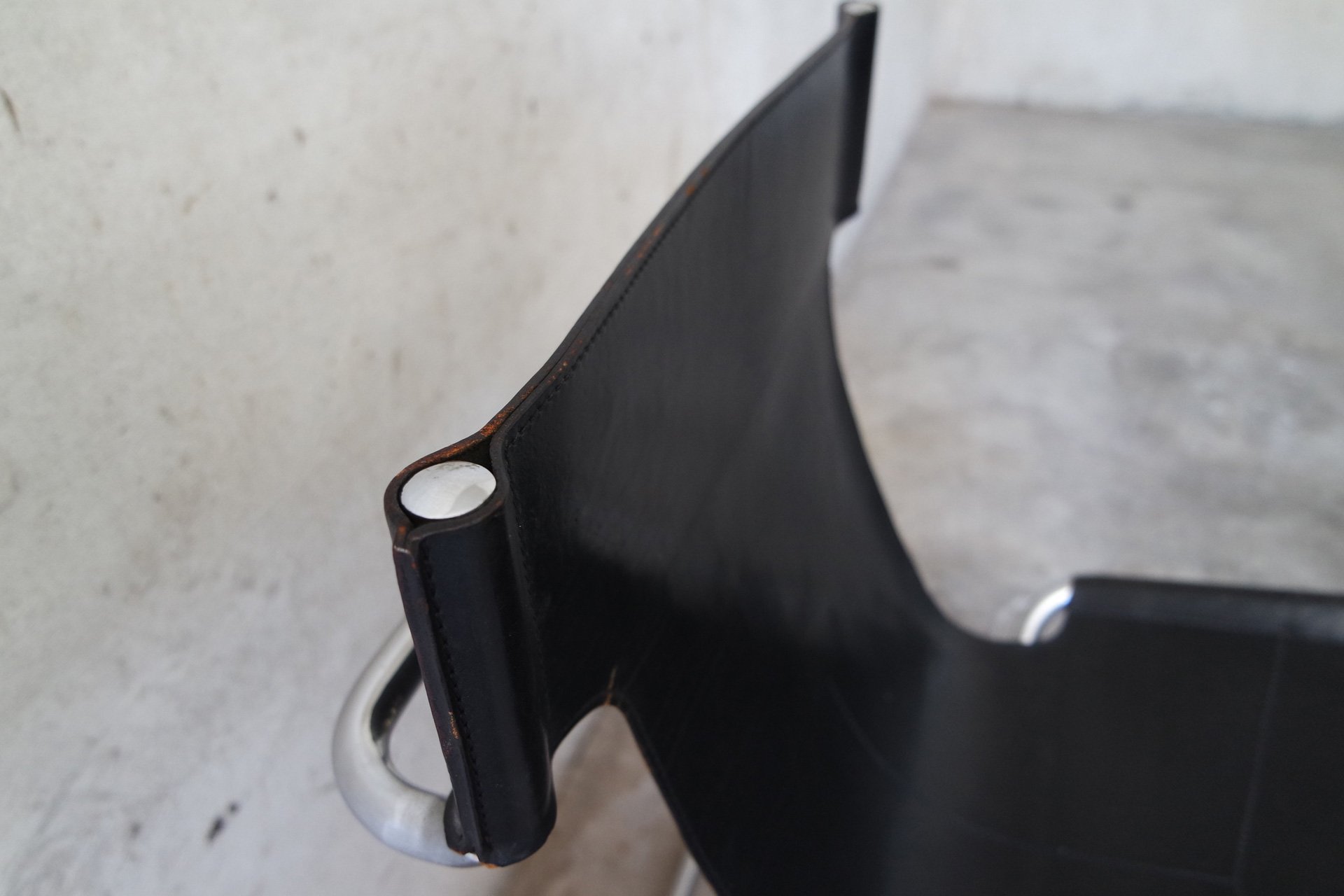 Sedia produzione Gruppo Dam per Gruppo industriale Busnelli Meda modello Topos anno 1969. Struttura in metallo cromato, sedile e schienale in cuoio originale di colore nero.
