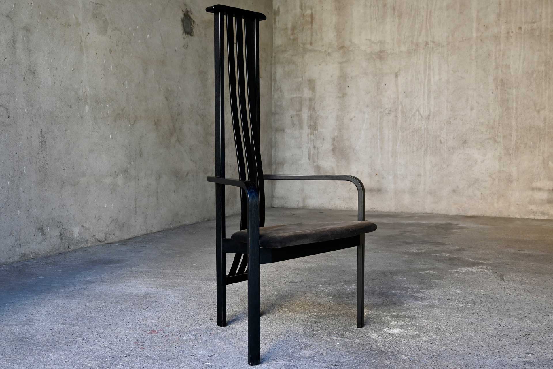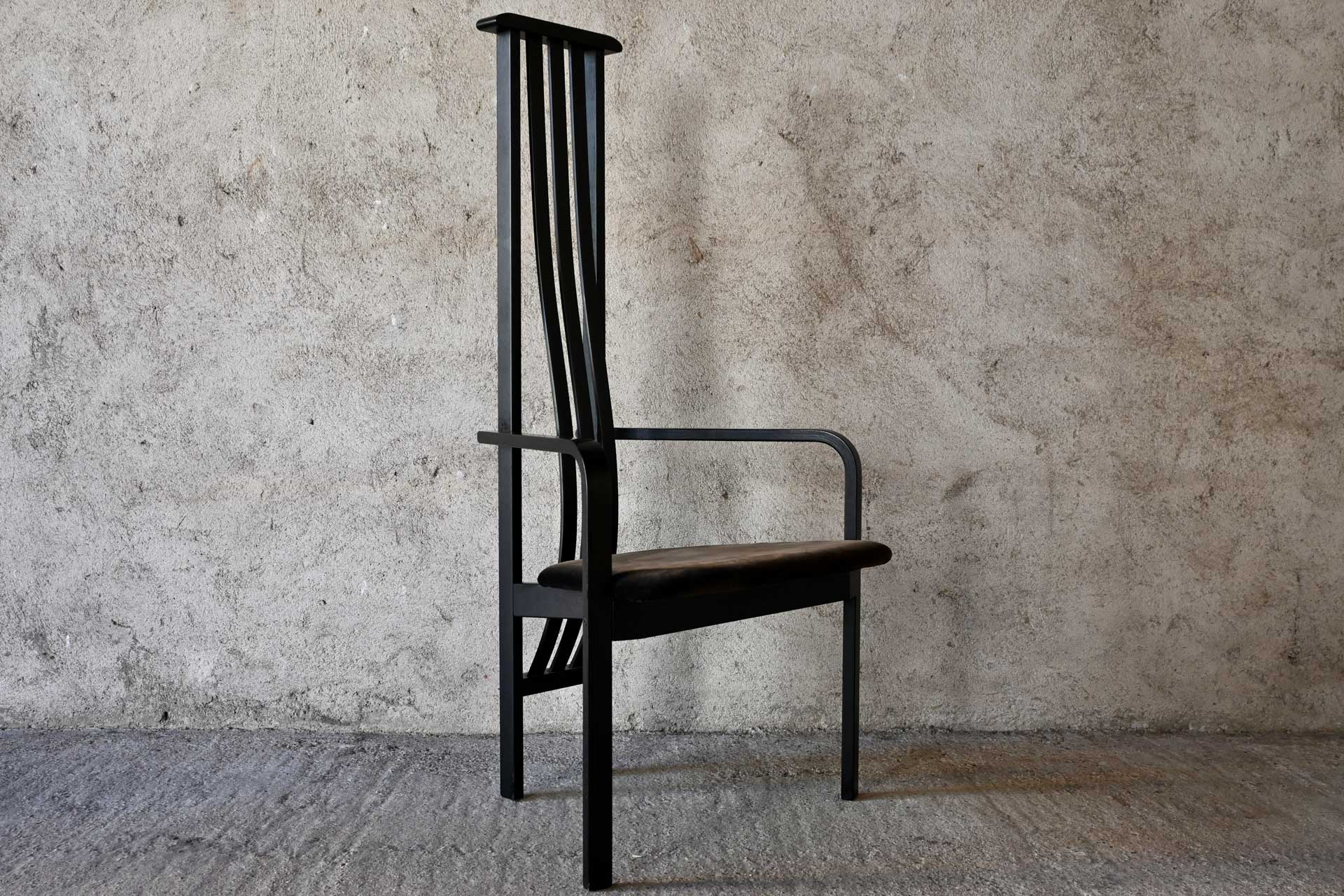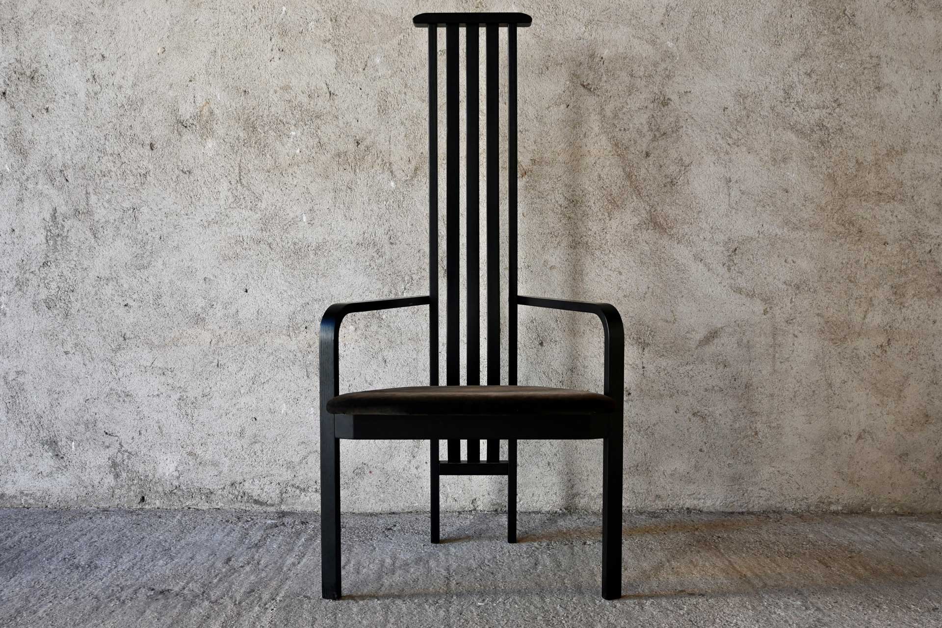 Poltroncina modello Babettis SD71 produzione Carlo Poggi Pavia design Vico Magistretti anno 1980. Struttura in legno di frassino massiccio con schienale alto a tre balestre, sedile imbottito e ricoperto in velluto di colore grigio scuro.