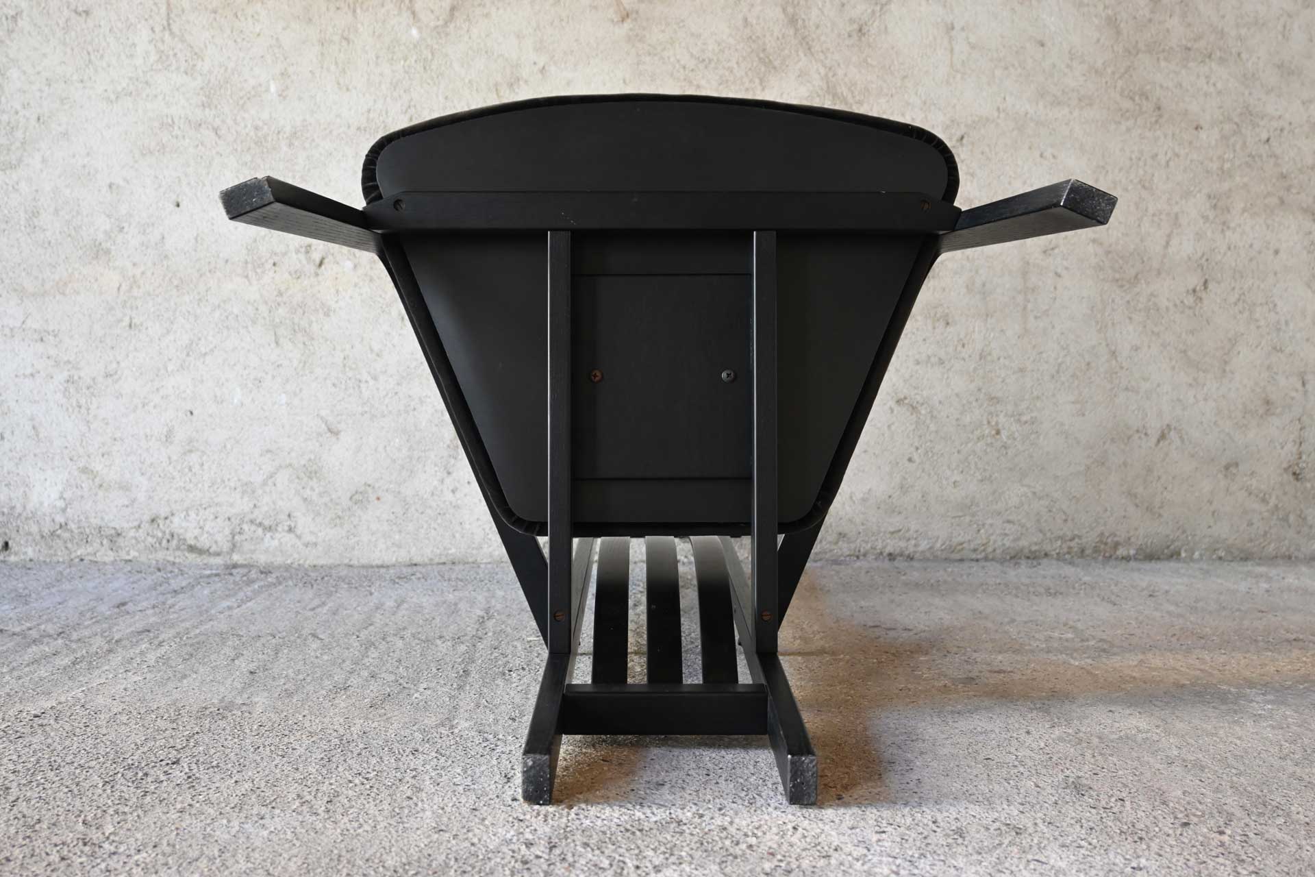 Poltroncina modello Babettis SD71 produzione Carlo Poggi Pavia design Vico Magistretti anno 1980. Struttura in legno di frassino massiccio con schienale alto a tre balestre, sedile imbottito e ricoperto in velluto di colore grigio scuro.