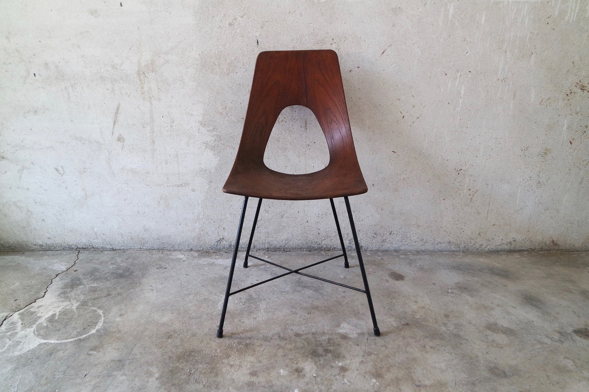 Sedia Ariston produzione Saporiti Italia e design Augusto Bozzi anno 1957. Struttura in metallo verniciato nero, scocca in compensato curvato. Etichetta della manifattura sotto la seduta.