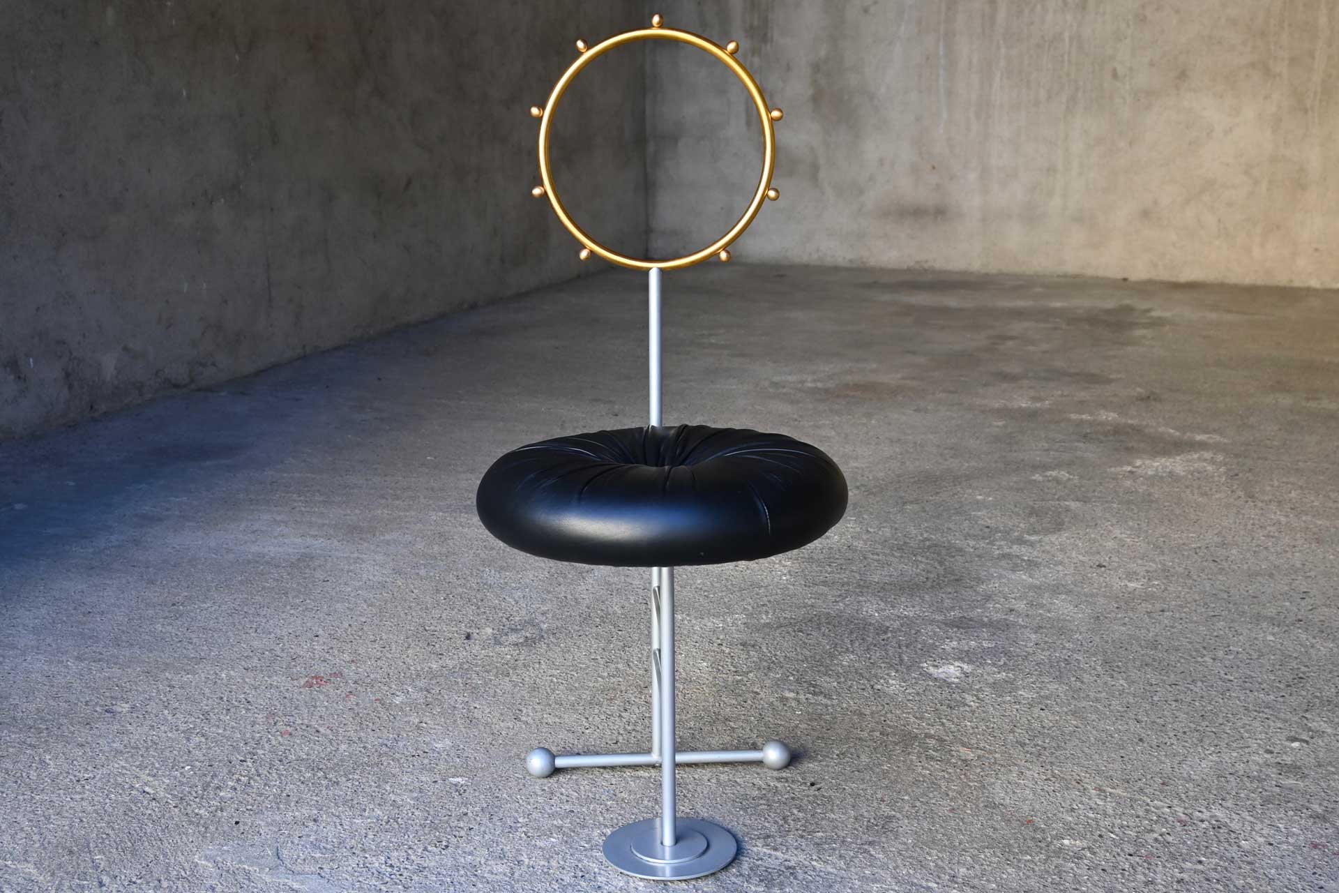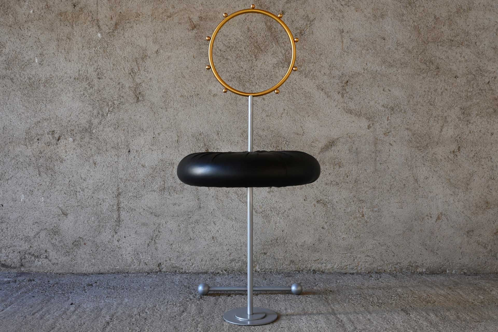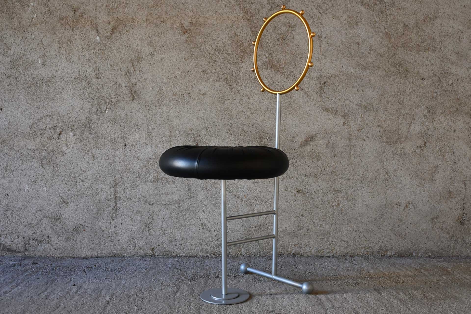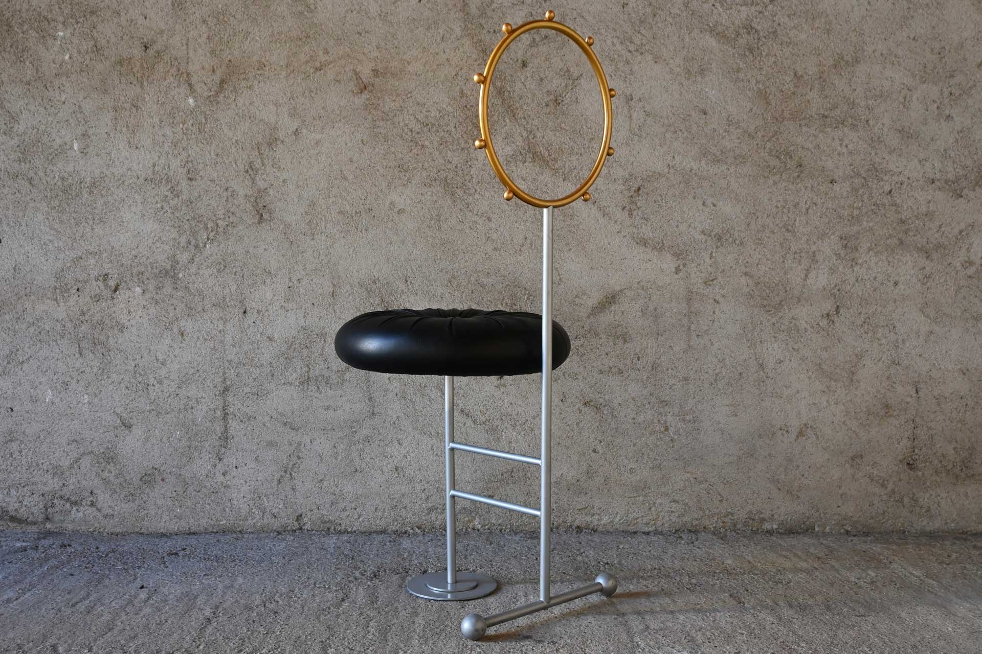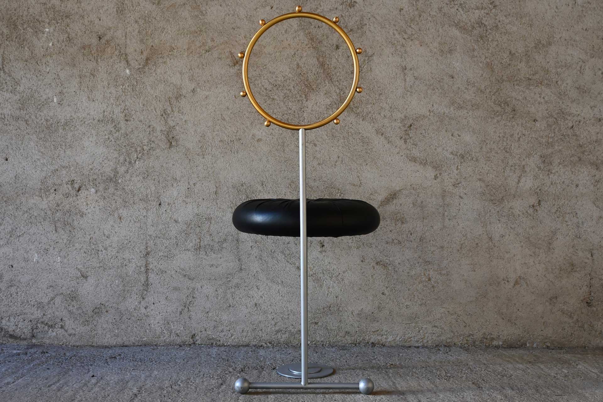 Sedia modello Santa produzione Sawaya & Moroni, design Luigi Serafini anno 1992. Struttura tubolare in metallo, schienale in ottone, seduta imbottita e rivestita in pelle di colore nero.