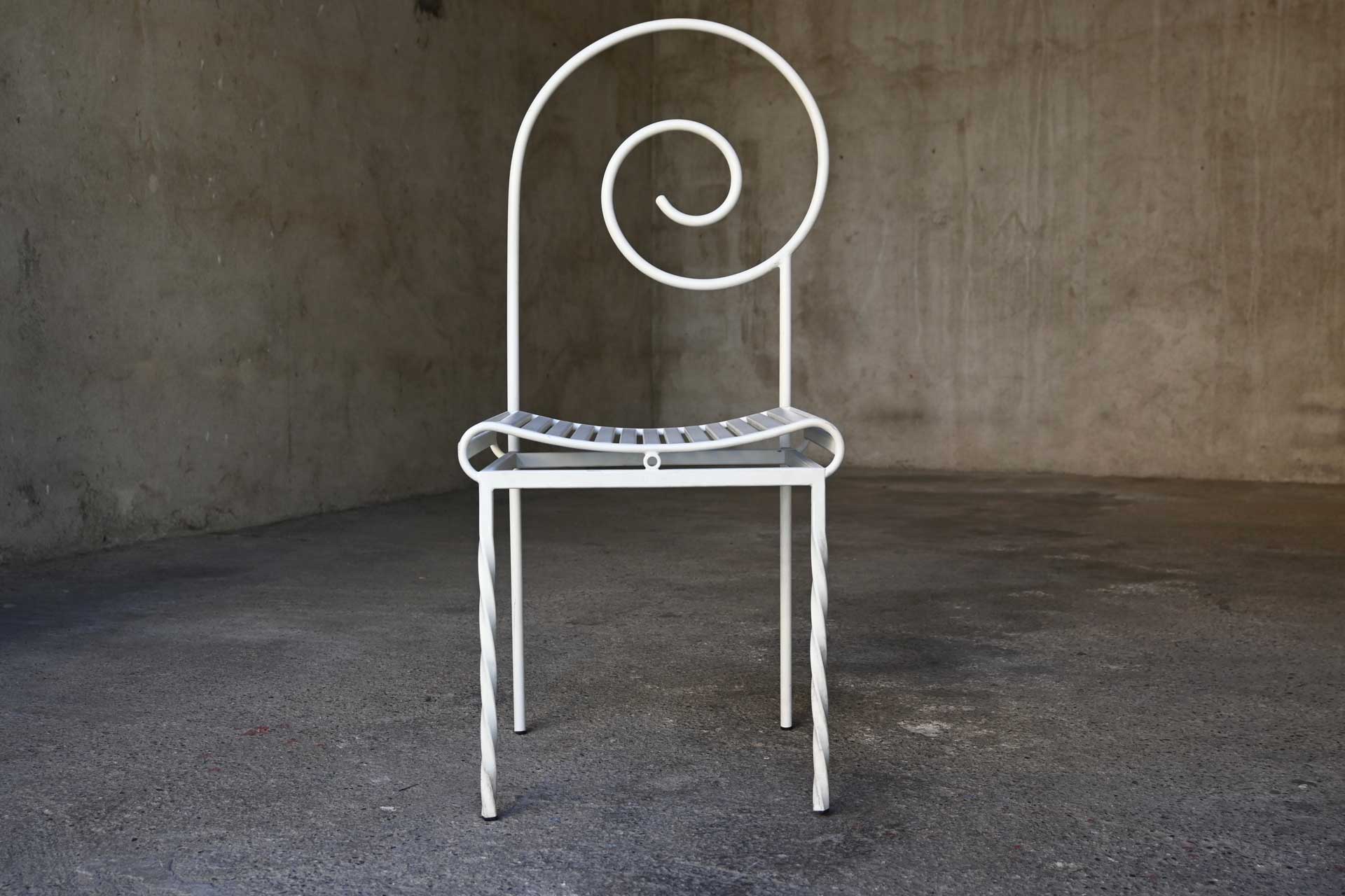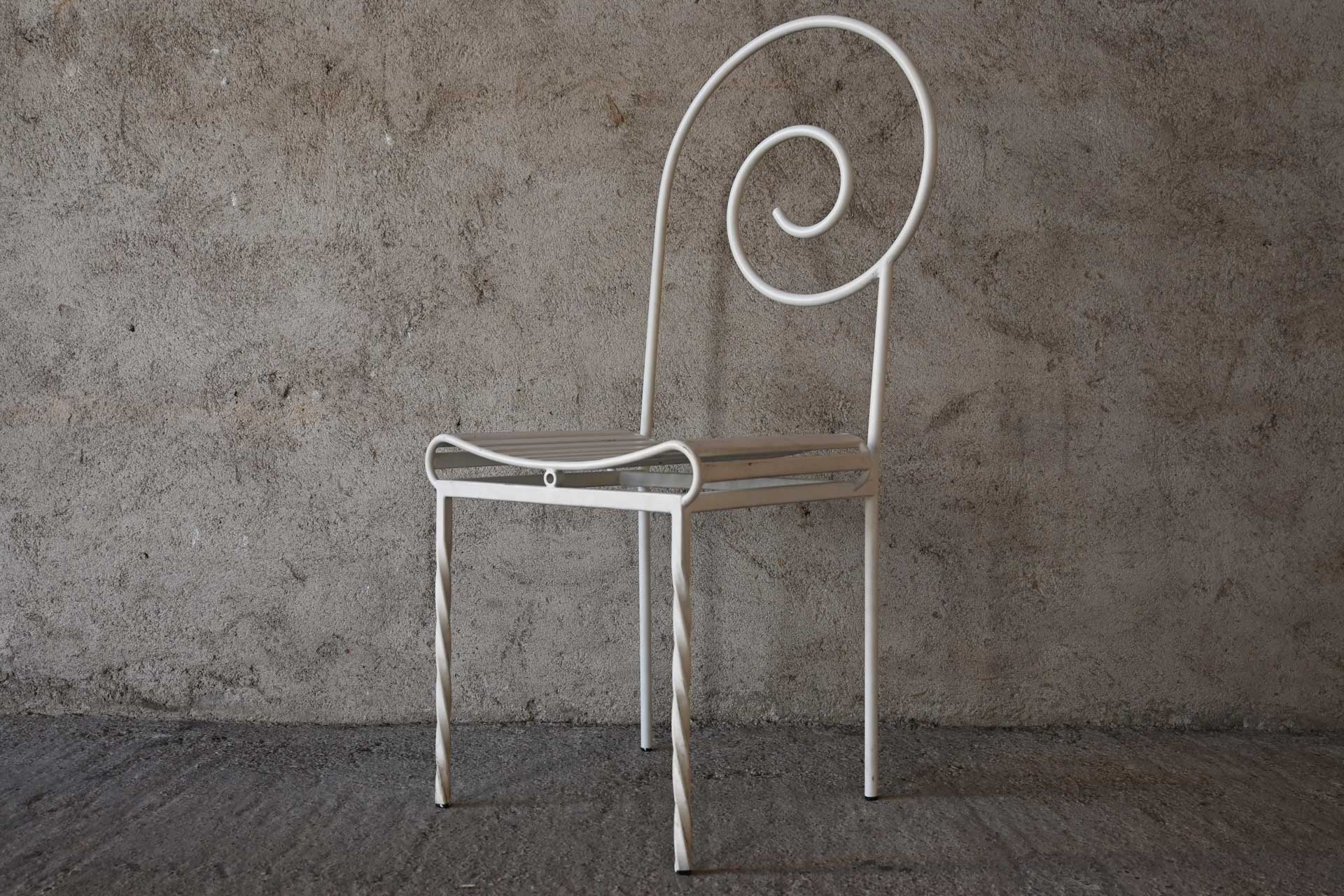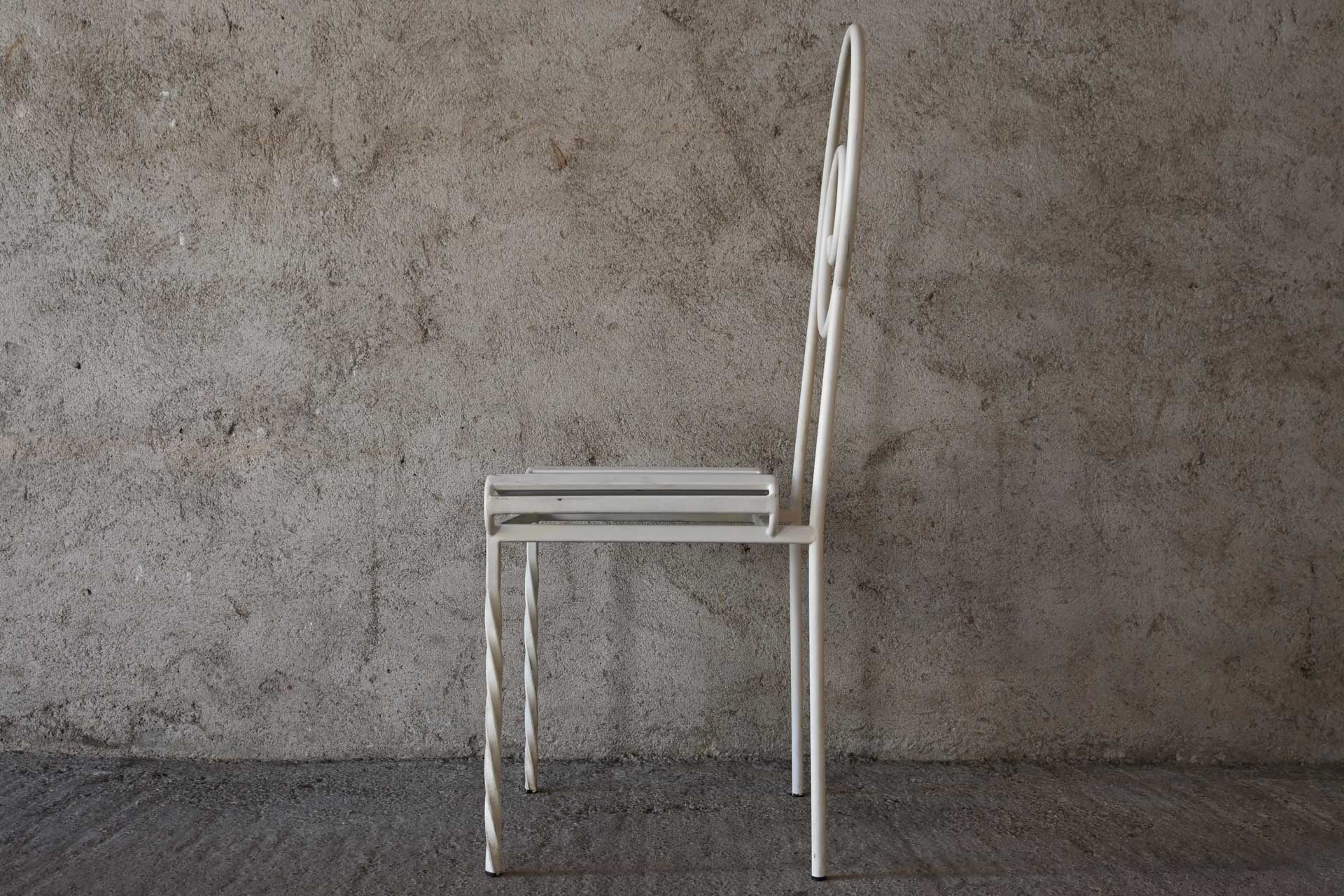 Sedia modello Suspiral produzione Sawaya & Moroni, design Luigi Serafini anno 1983. Struttura tubolare in ferro battuto laccato di colore bianco.