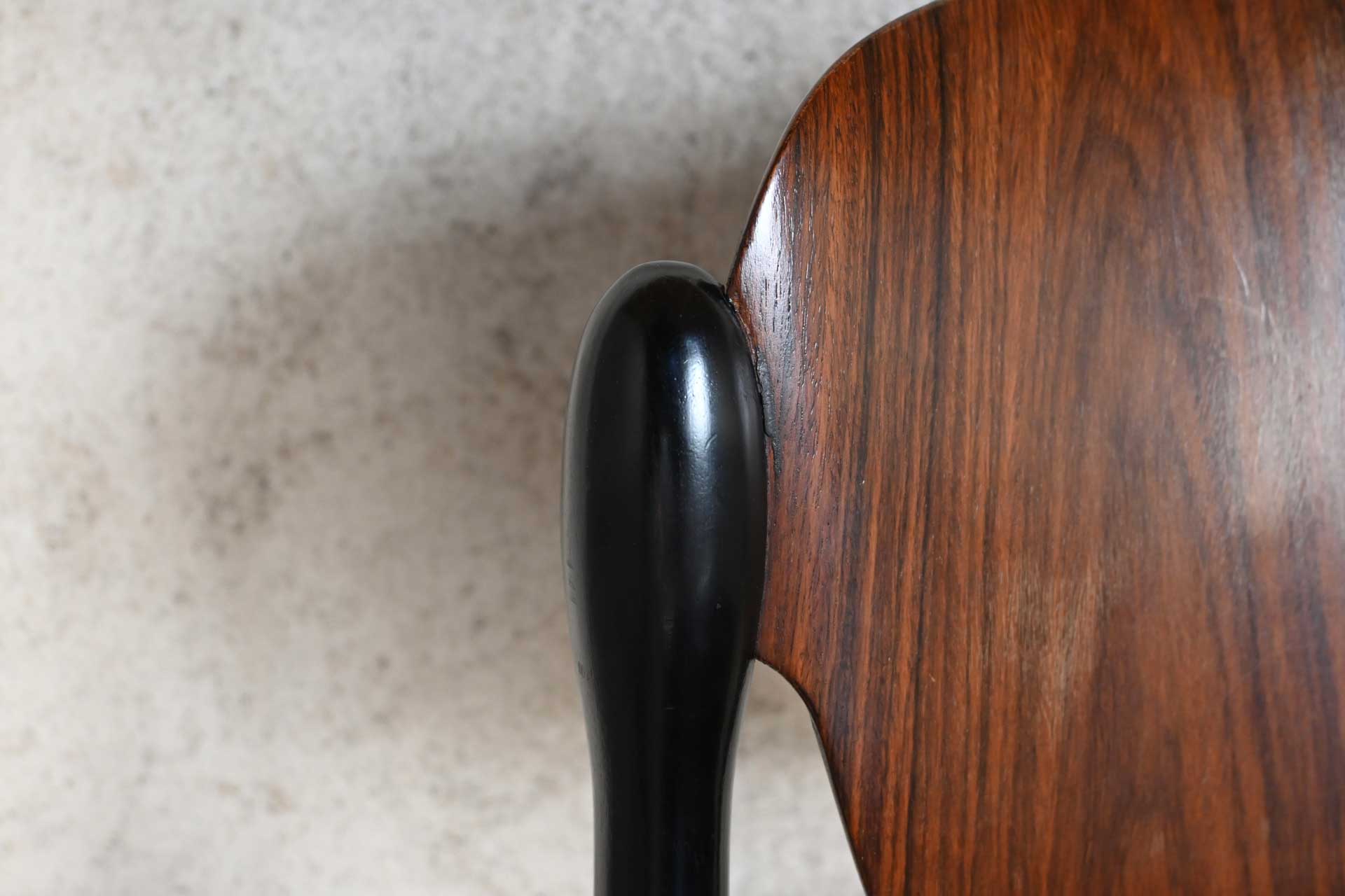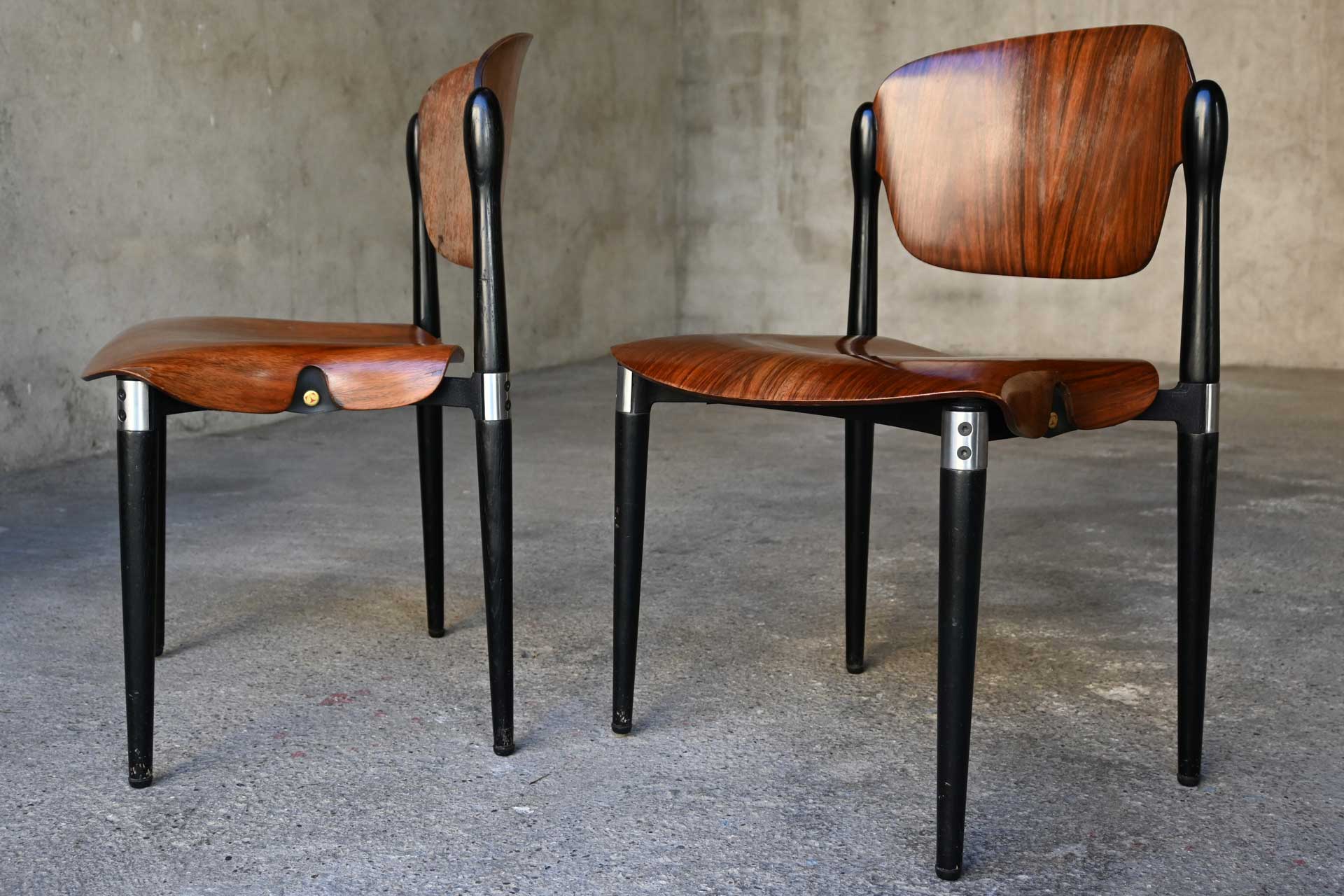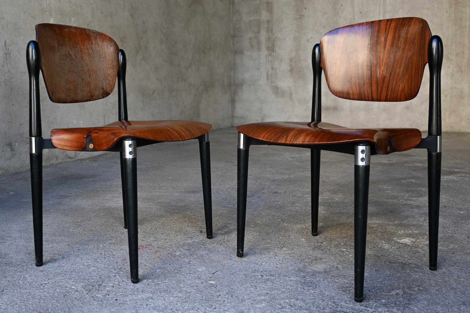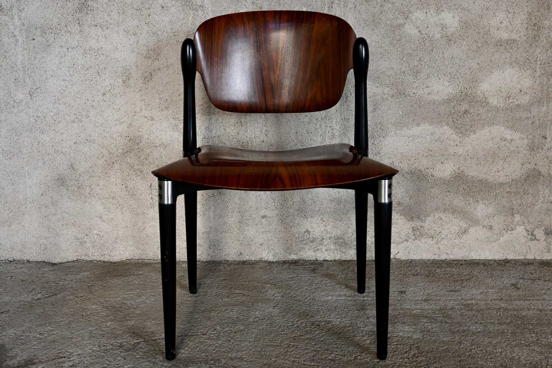 Sedia modello S83 produzione Tecno, design Eugenio Gerli, anno 1962. Struttura pressofusa in alluminio, sedile e schienale in compensato stampato e lastronato in legno di palissandro. Simbolo della manifattura nelle traverse laterali della seduta.
